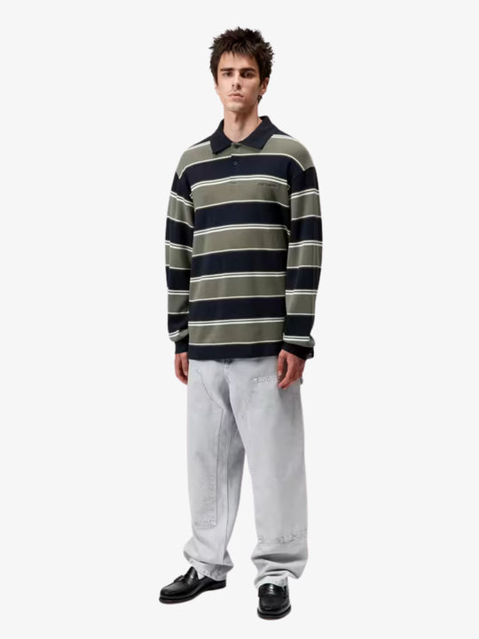 The Long Sleeve Malone Rugby Shirt by Carhartt Wip is cut from heavyweight textured cotton waffle with a loose fit. It features a flatknit collar, a buttoned placket, ribbed cuffs, and an embroidered Script Logo at the chest.