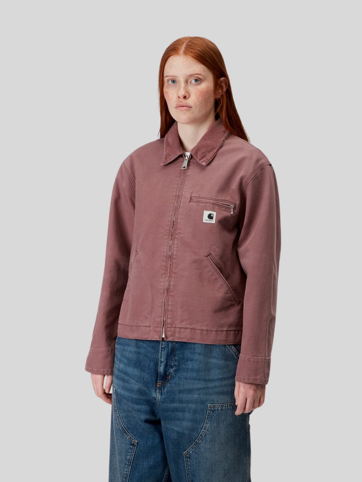 The Women's OG Detroit Jacket in Dusky Pink by Carhartt Wip is crafted from heavyweight 12 oz Dearborn Canvas made of 100% organic cotton. This jacket features a loose fit that provides a relaxed feel.