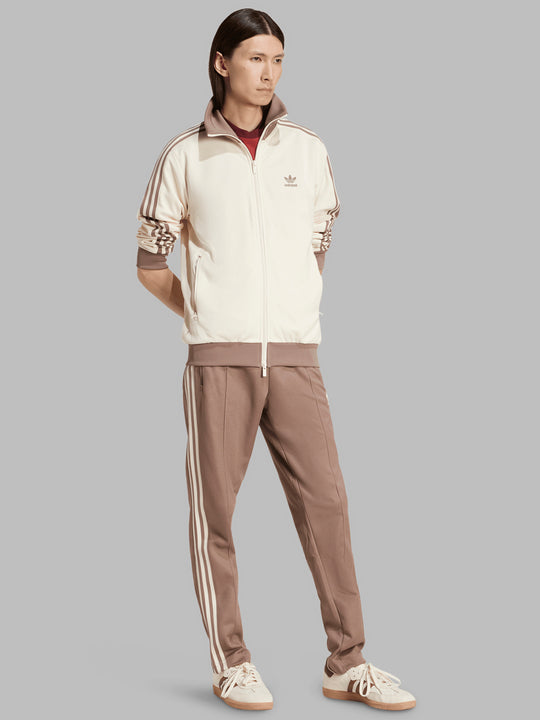 The Classic Track Top in Wonder White/Trace Brown by Adidas showcases the signature 3-stripes tape along the sleeves and an embroidered Trefoil logo. This track top features the streamlined fit and stand collar that creates a polished yet relaxed look.