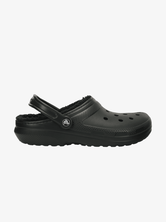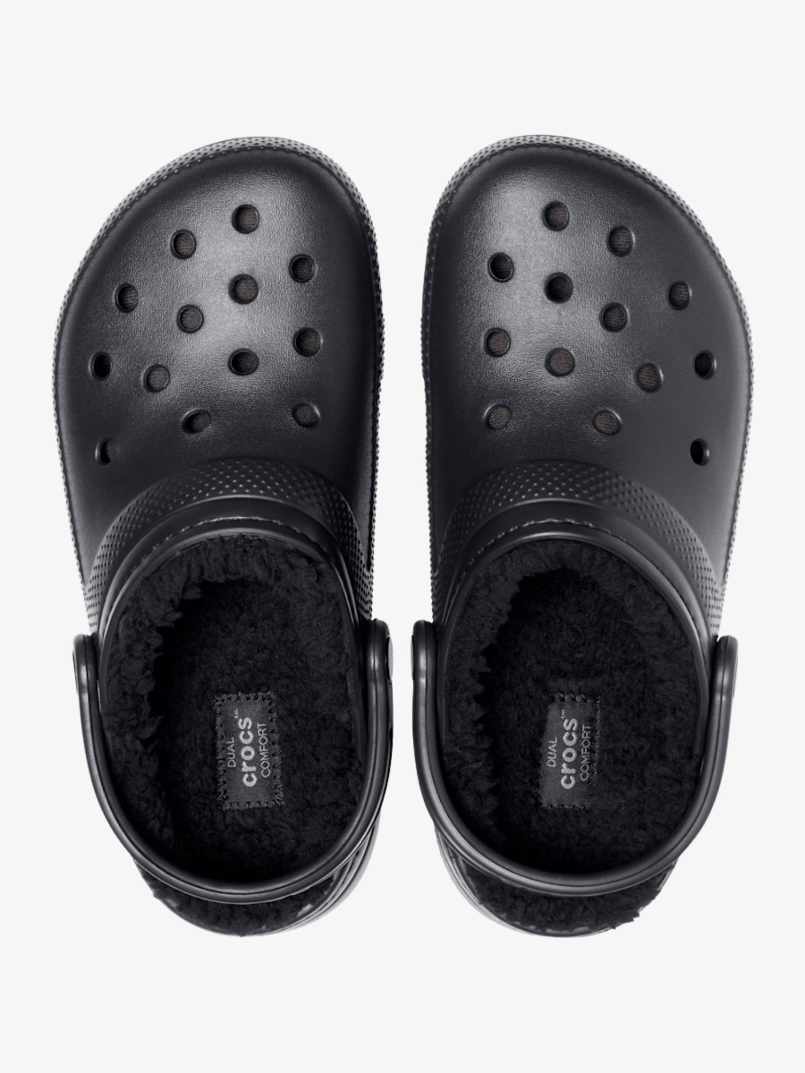 The Classic Lined Clog in Black/Black by Crocs is crafted from Croslite foam. This clog features a cozy twist on the iconic Crocs silhouette.