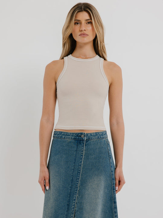 This Dahlia Stitch Tank Top features a rib bound crew neckline and arm holes, as well as a ribbed fabrication and bodycon fit. It is designed to fit close to the body and has a moderate stretch for comfort.