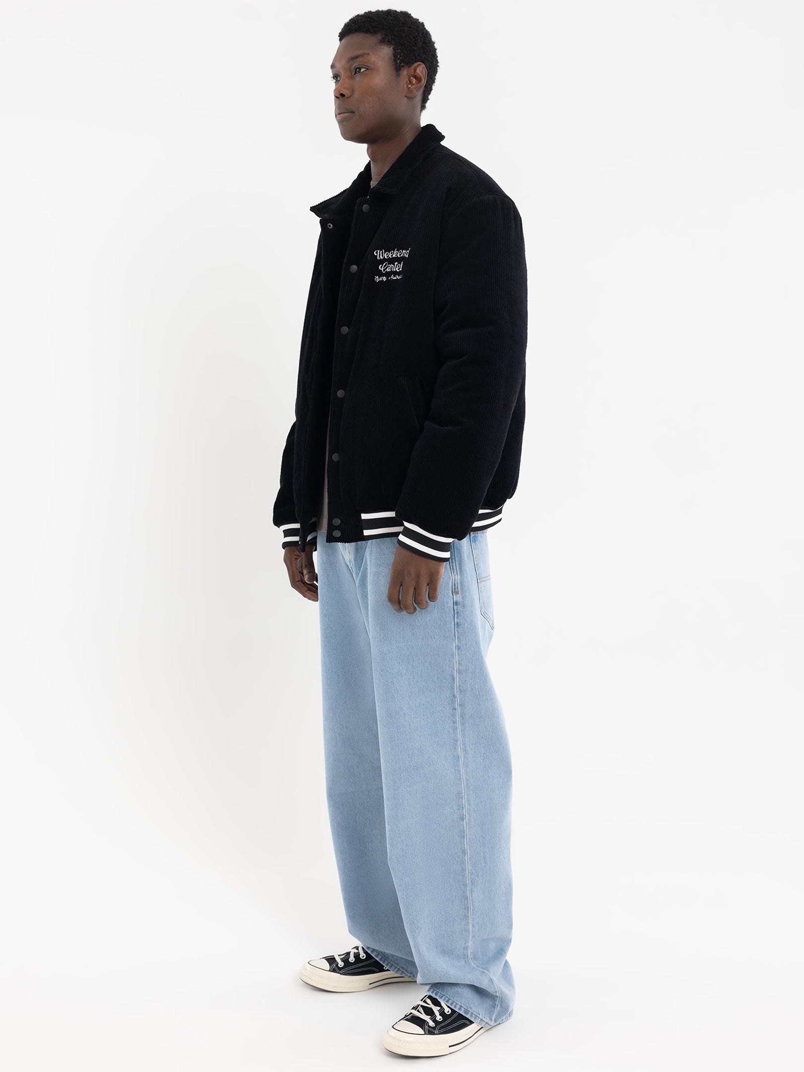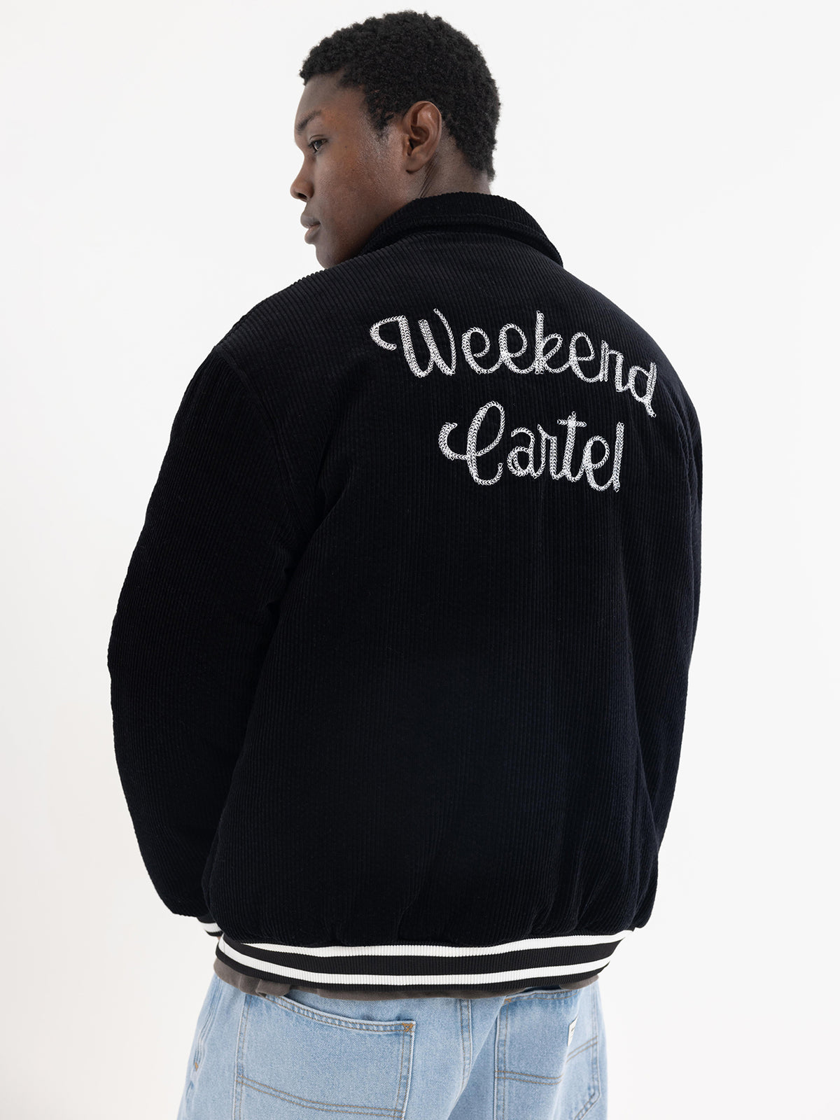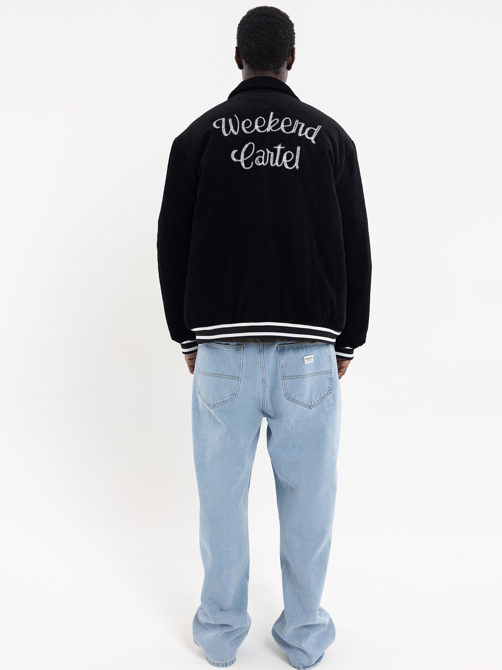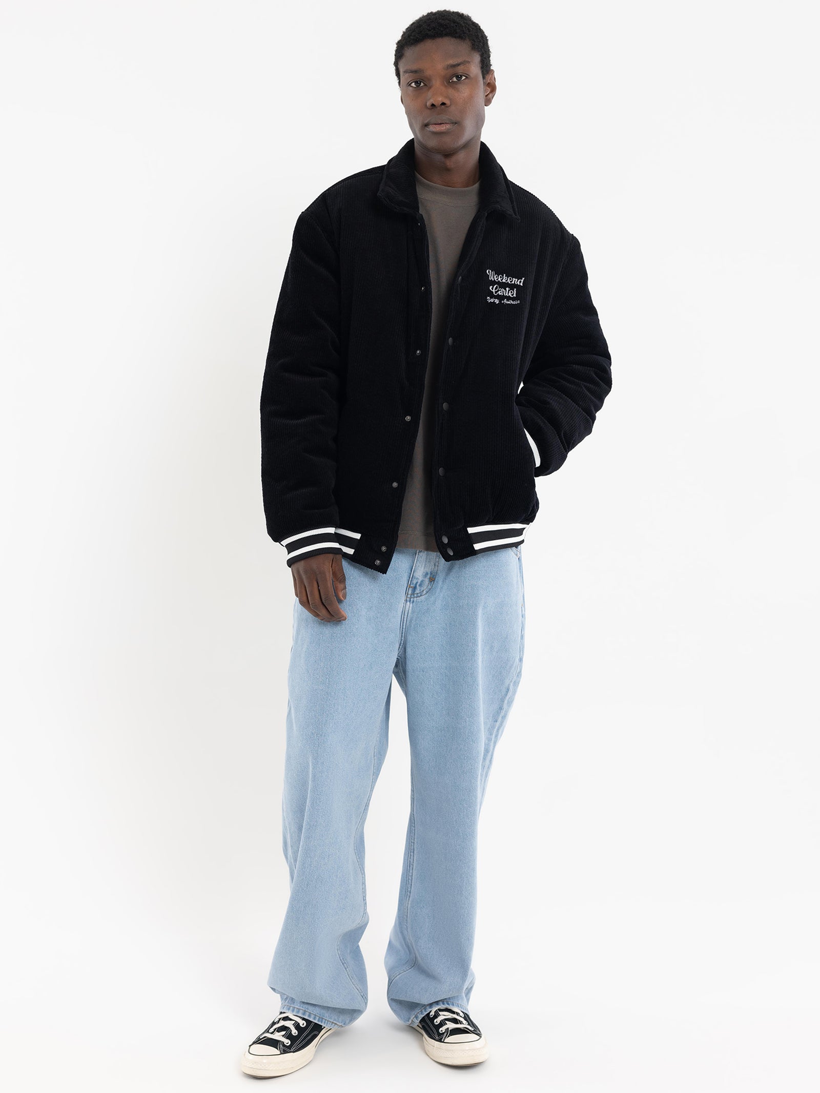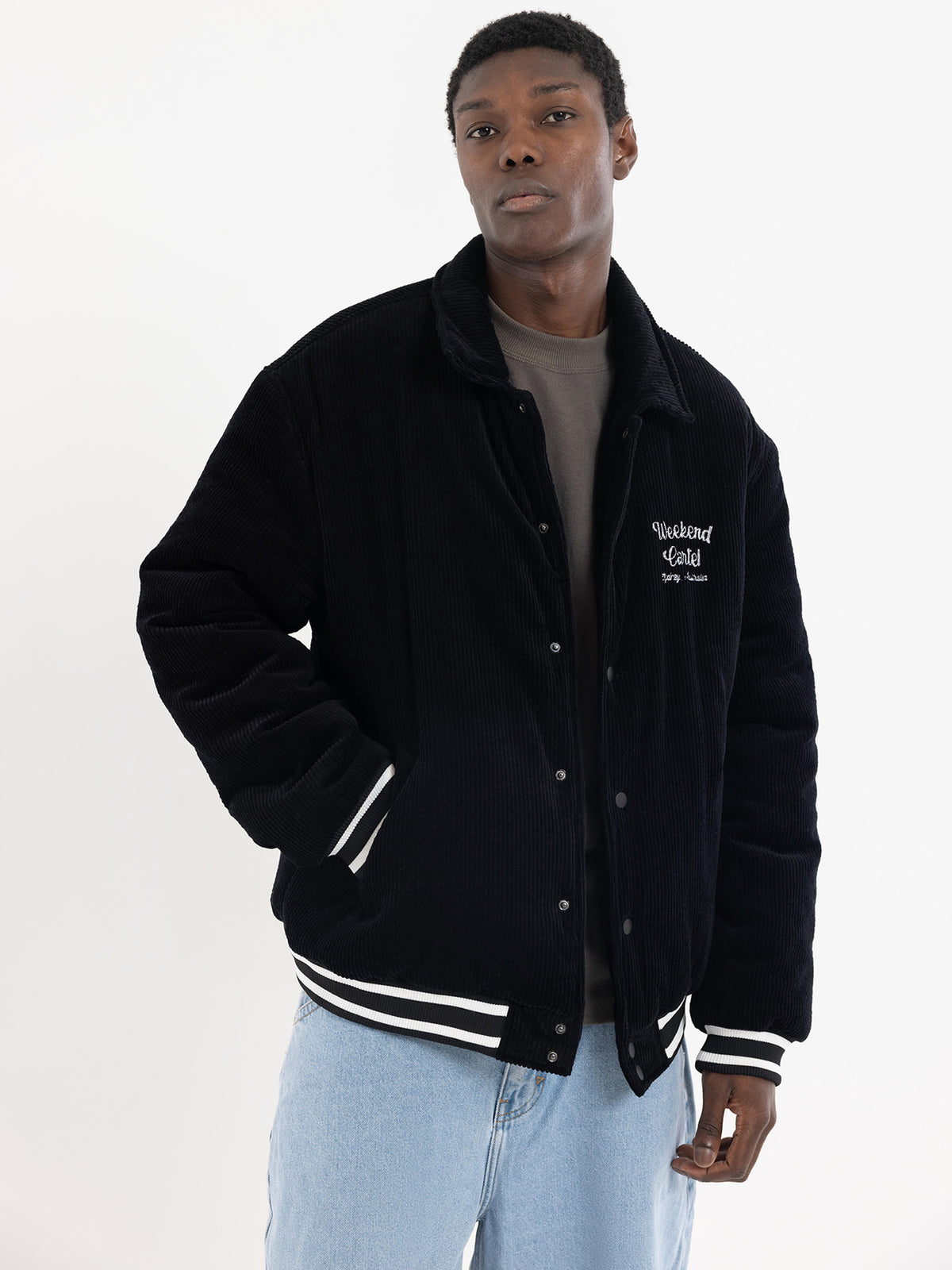 The David Letterman Jacket is a stylish option for any fan. Embroidered logos adorn the front and back, while the snap closure allows for easy wear. The ribbed hemline and cuffs provide comfortable fit, and the contrasting stripes add a touch of uniqueness to this classic piece.