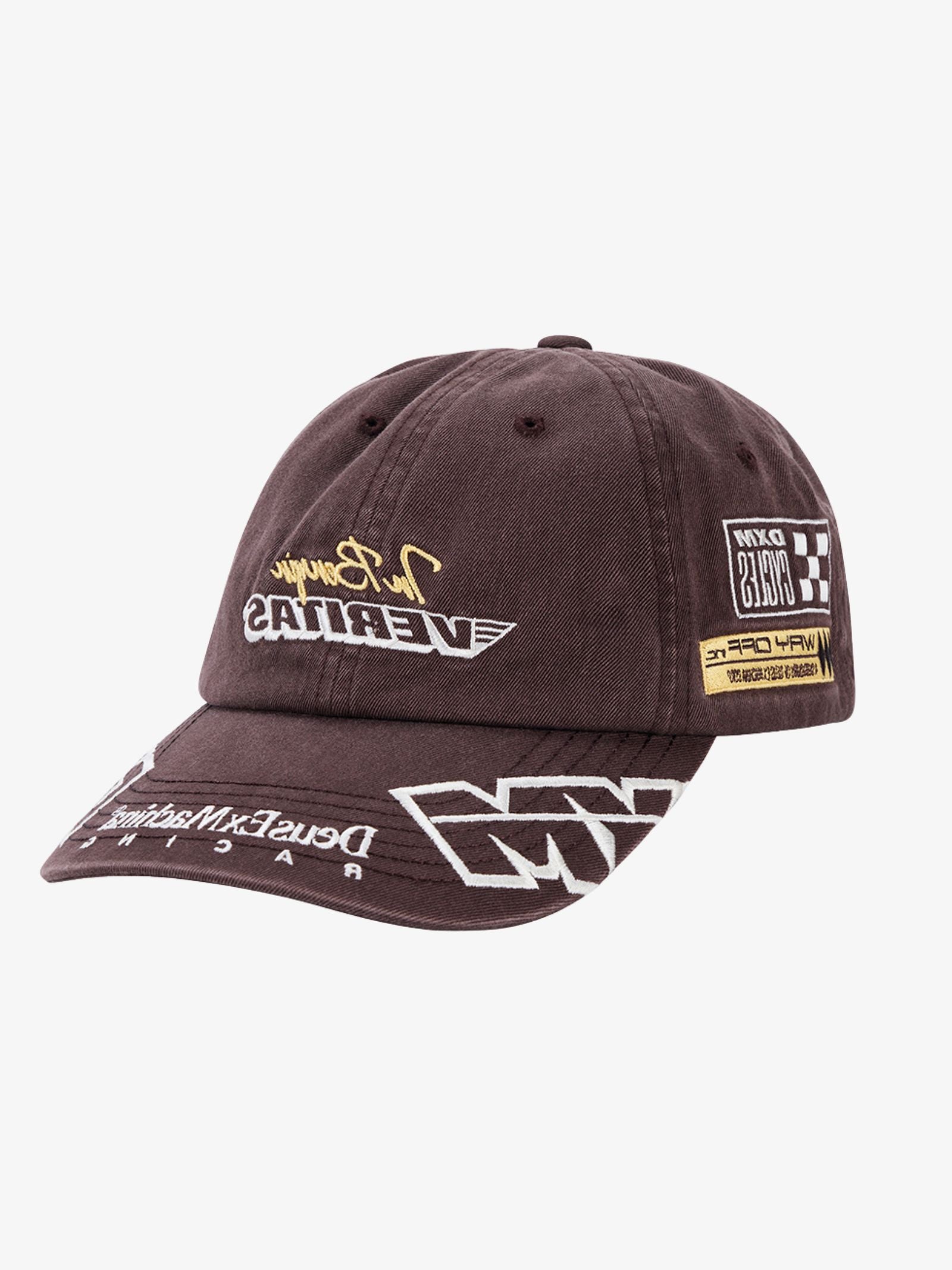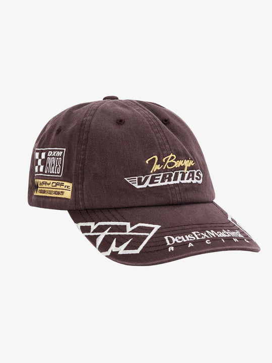 The Ace Moto Cap by Deus is a multi-graphic headwear piece featuring a classic six-panel baseball cap silhouette. This cap is defined by extensive embroidery, including "VERITAS" with wings on the front, racing-inspired patches on the sides, and "DEUS RACING" text on the rear strap.