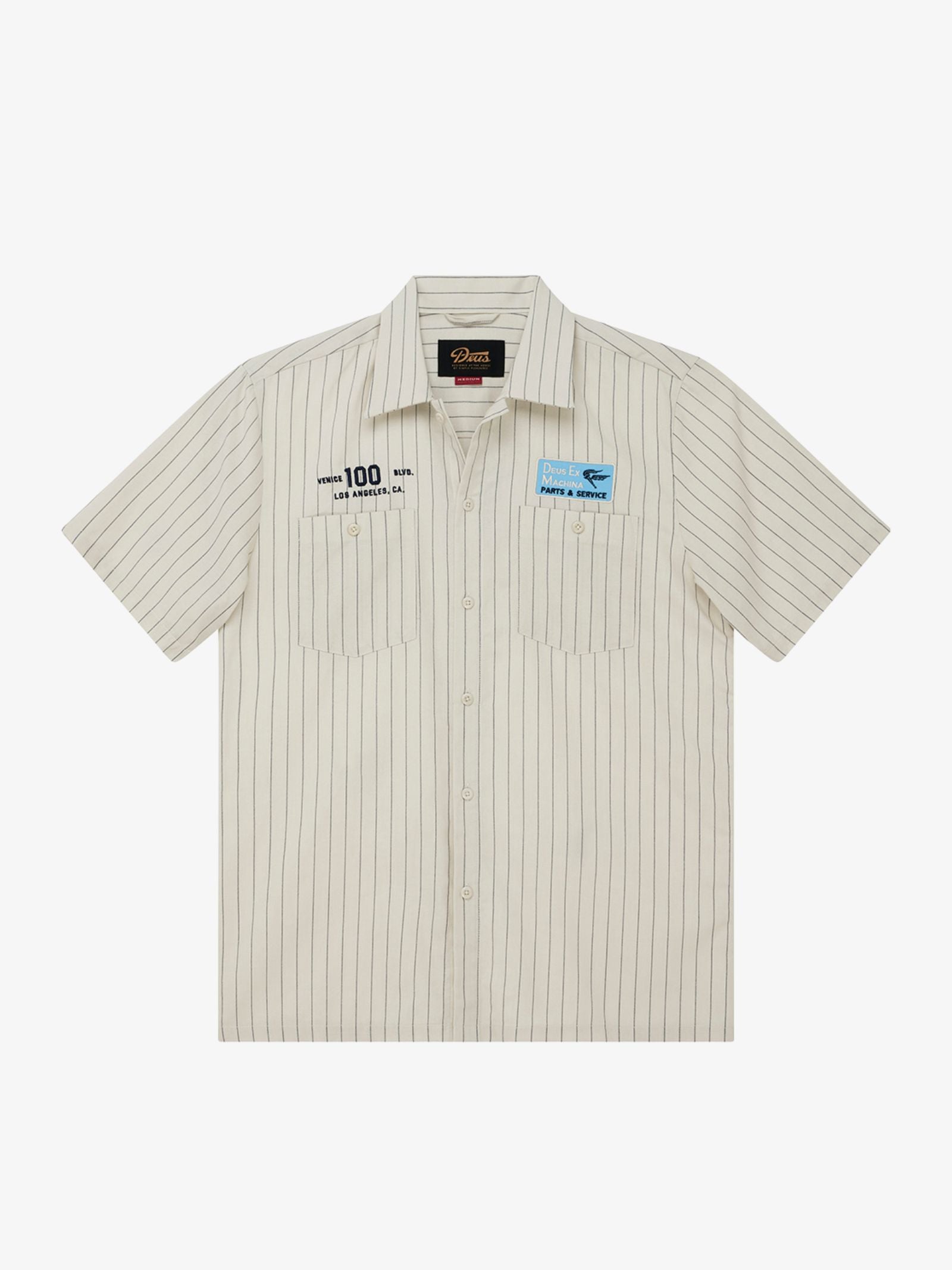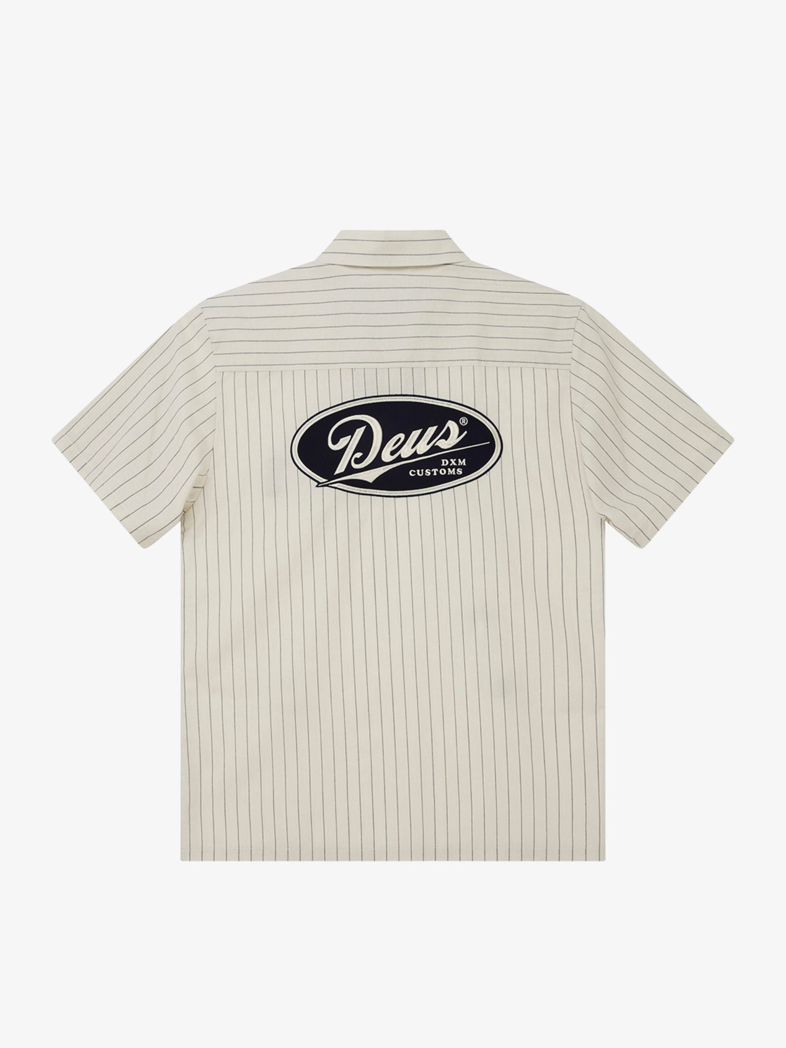 The Forecourt Stripe Shirt by Deus is a technical lifestyle garment featuring a vertical pinstripe pattern and functional workwear aesthetic. This short sleeve shirt is defined by its dual chest patch pockets and high-contrast automotive-inspired branding on the front and rear.