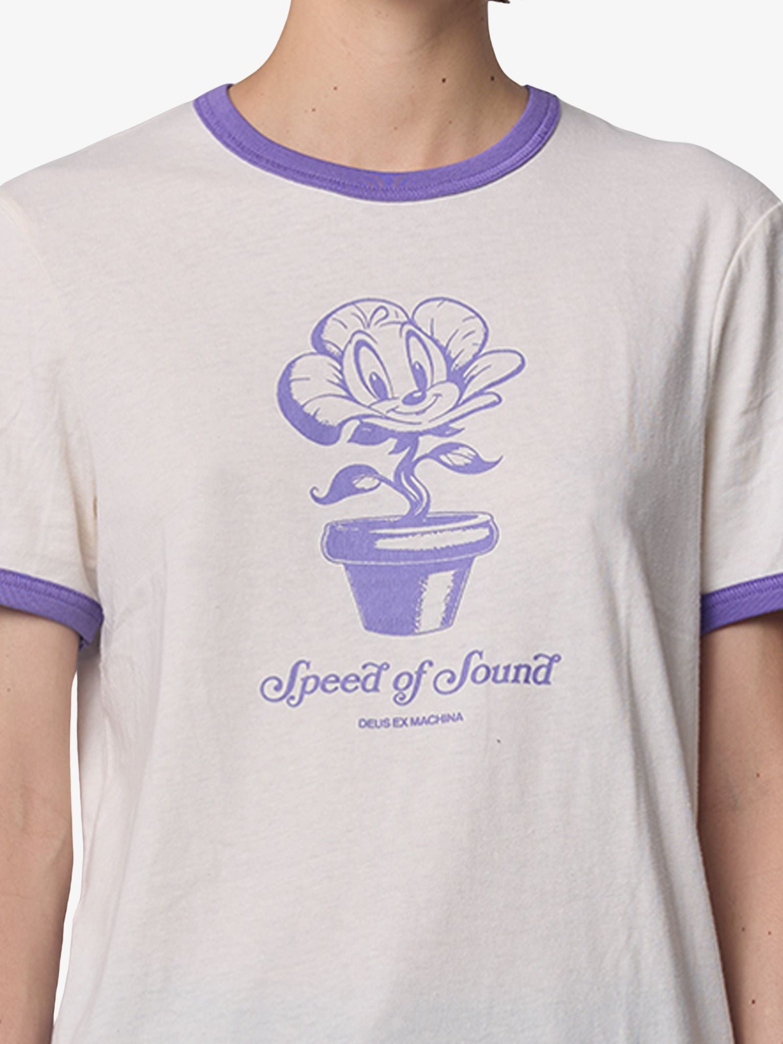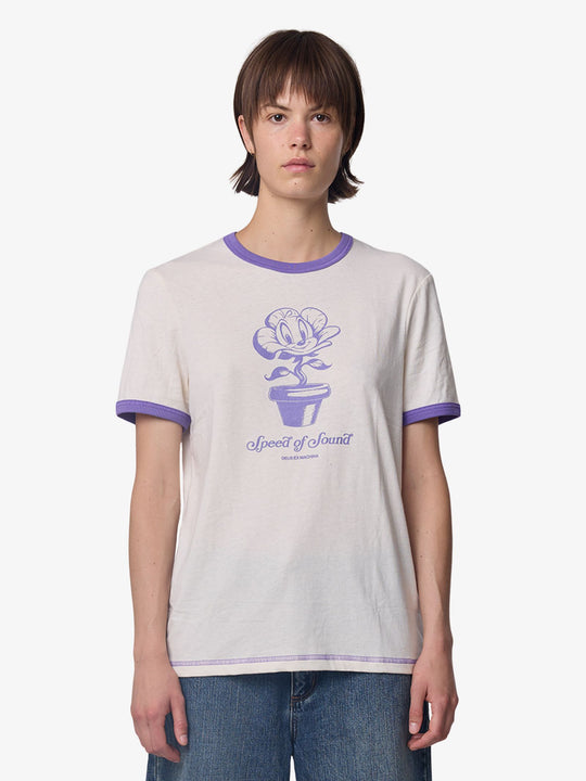 The Green Thumb Ringer Tee by Deus is made from soft cotton jersey and designed with a straight, regular fit. This short-sleeve shirt features contrast trim ringer details at the neck and sleeves, and a large central graphic print of a potted flower character.
