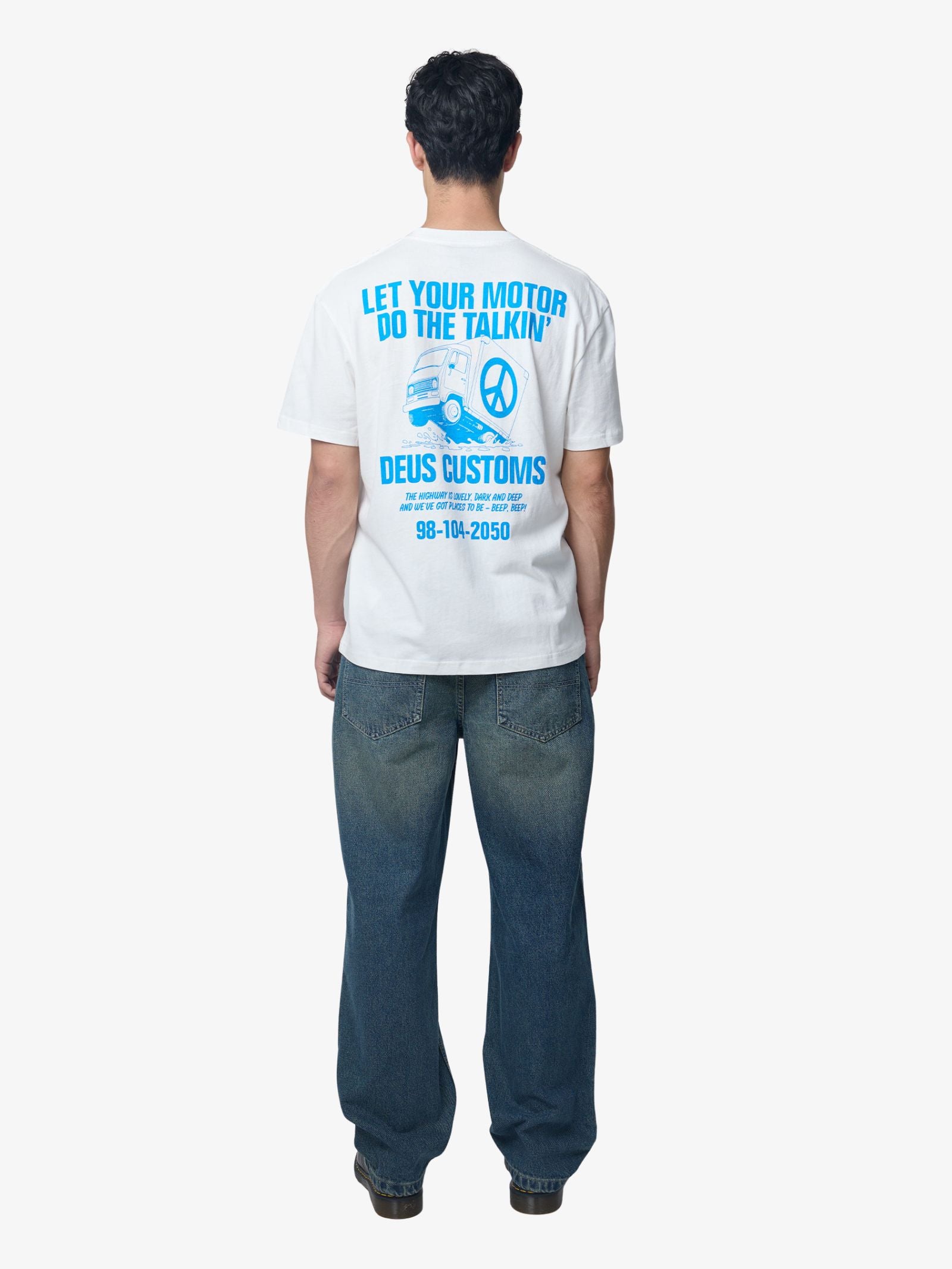 The Highway Language Tee by Deus is a loose-fitting, short-sleeve top featuring a small contrast graphic on the left chest that includes a van, a peace sign, and the text "DEUS CUSTOMS". The back features a large, detailed graphic print with the phrase "LET YOUR MOTOR DO THE TALKIN'," a large van, and full contact details.