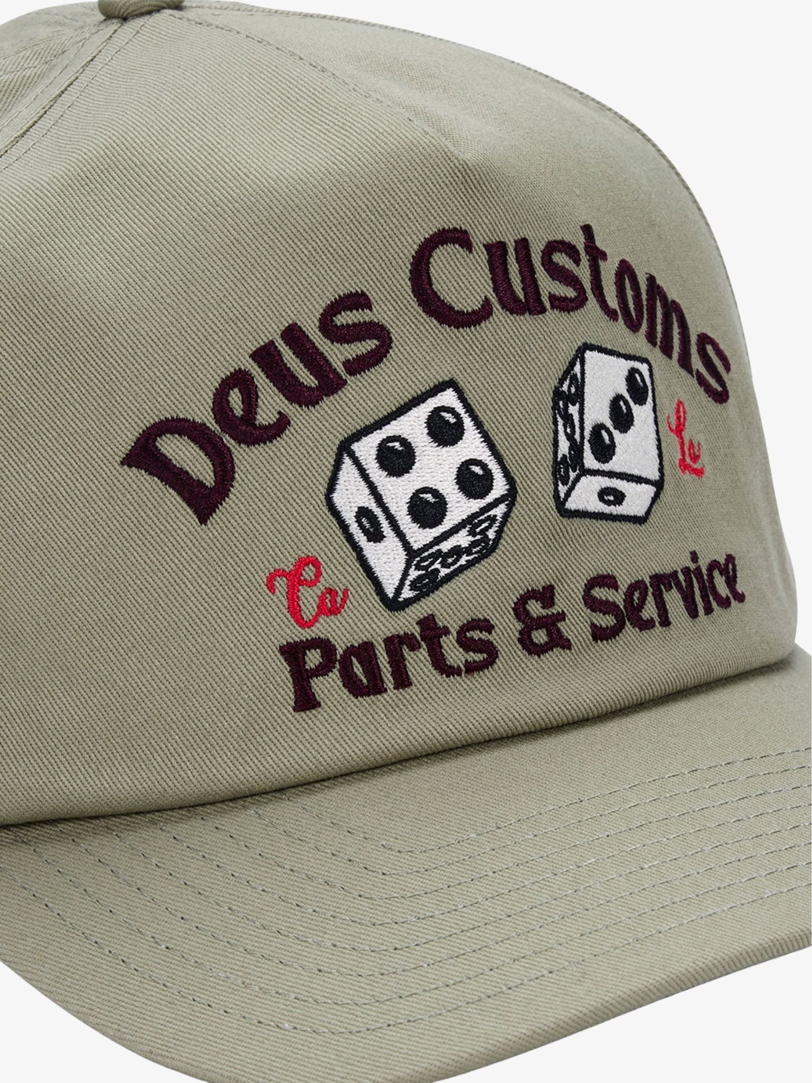 The Knucklebones Cap by Deus is a classic 5-panel trucker-style hat with a bold, heritage-inspired aesthetic. Constructed from a durable red cotton twill, this cap features intricate white and black embroidery on the front depicting a "Deus Customs Parts & Service" graphic alongside two dice. The design is finished with tonal script embroidery on the rear and a classic adjustable snapback closure for a custom fit.