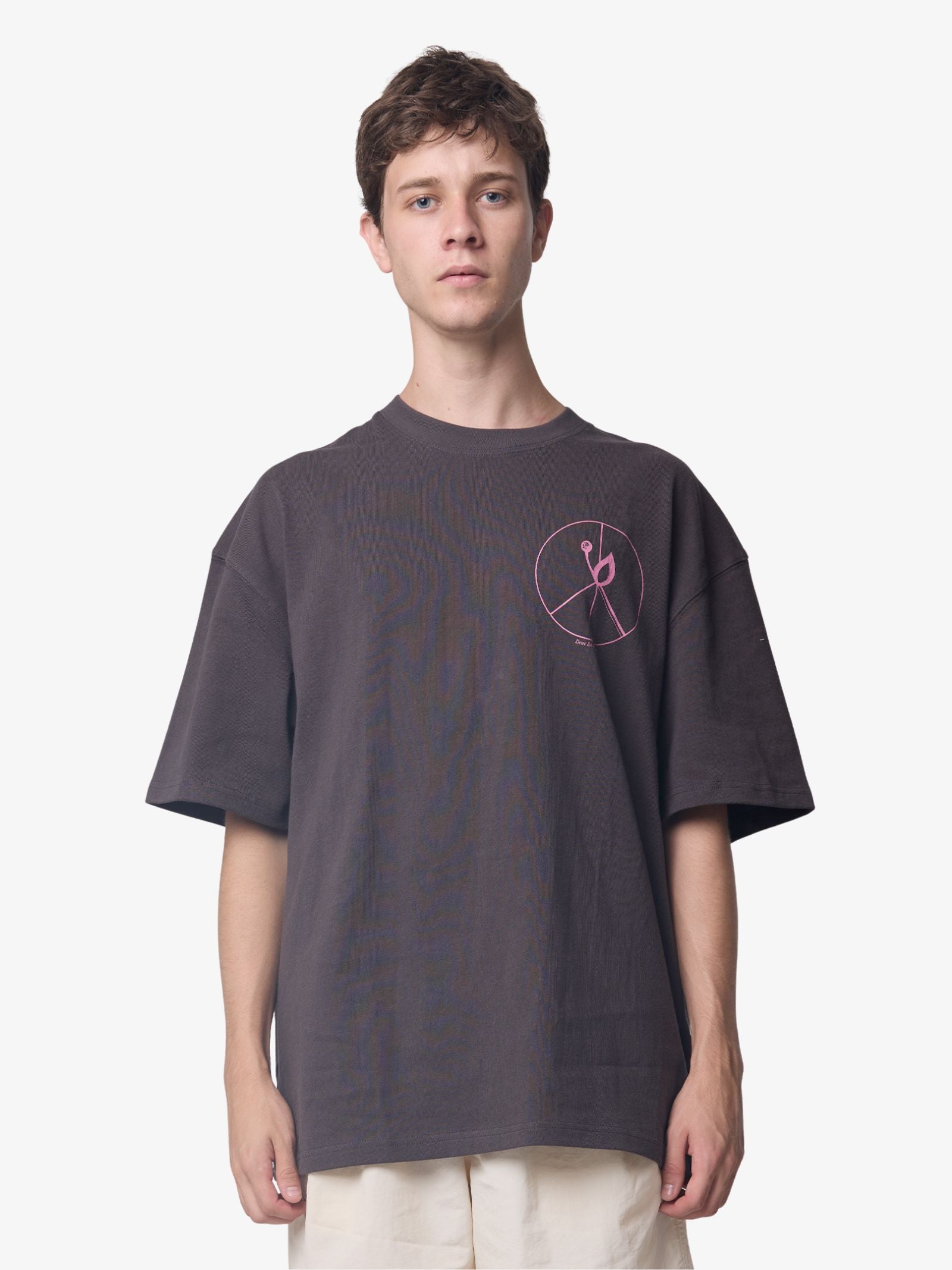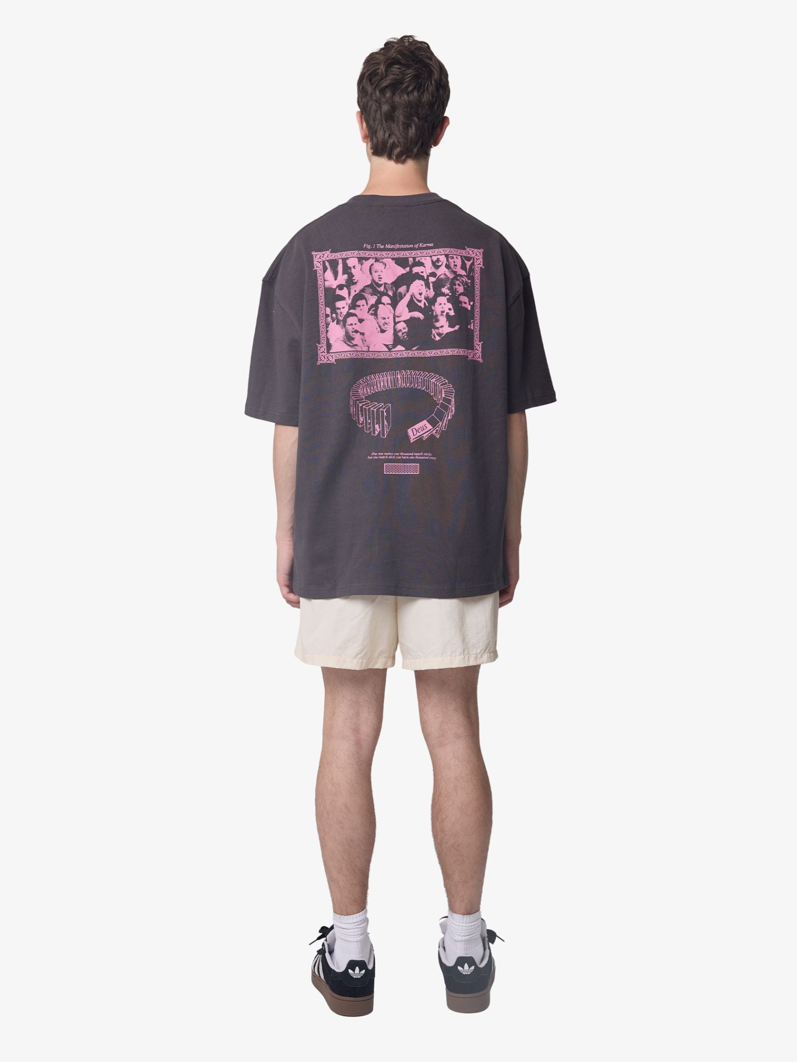 The Matchstick Tee by Deus is a comfortable t-shirt featuring an oversized, boxy fit and a classic crew neckline. It is made from heavyweight cotton jersey. The design features a small circular graphic print on the chest and a large, detailed multi-graphic print covering the entire back.