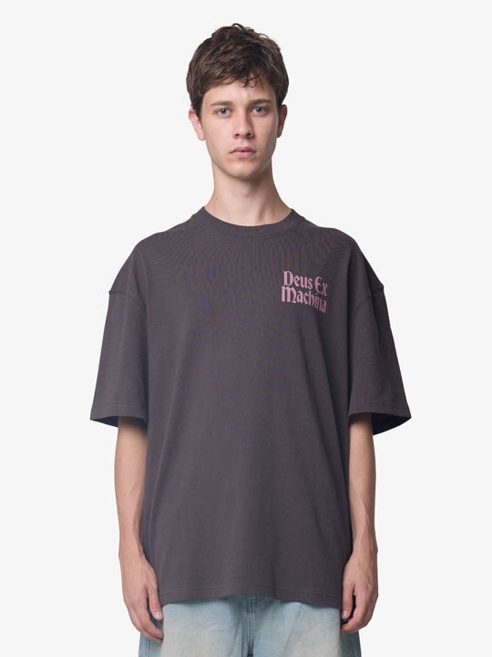 The Mycelium Tee by Deus is made from heavyweight cotton jersey and features an oversized, boxy fit with a classic crew neckline. The t-shirt is designed with a small Deus Ex Machina logo print on the chest and a large, elaborate mushroom and text graphic print across the upper back.