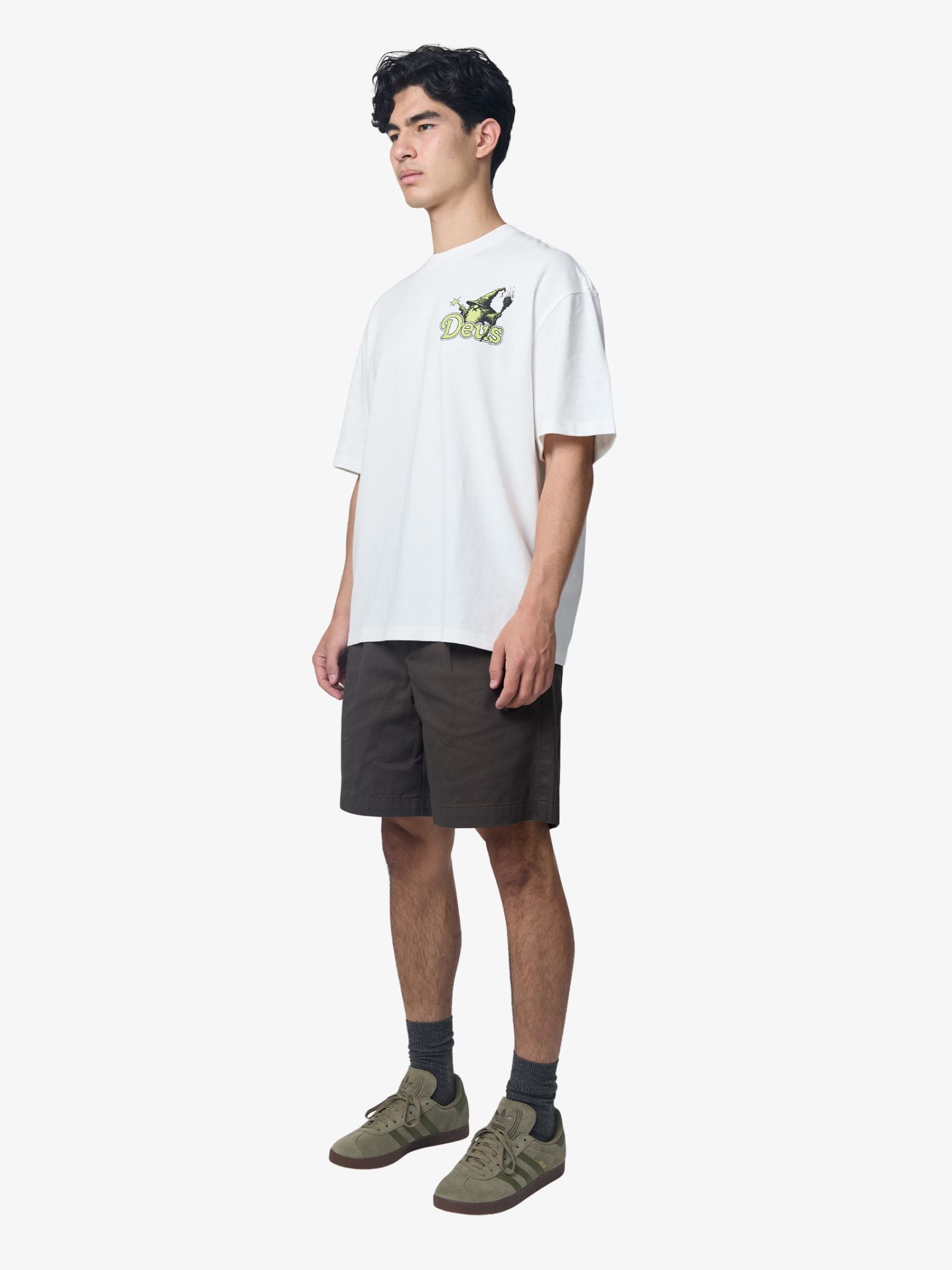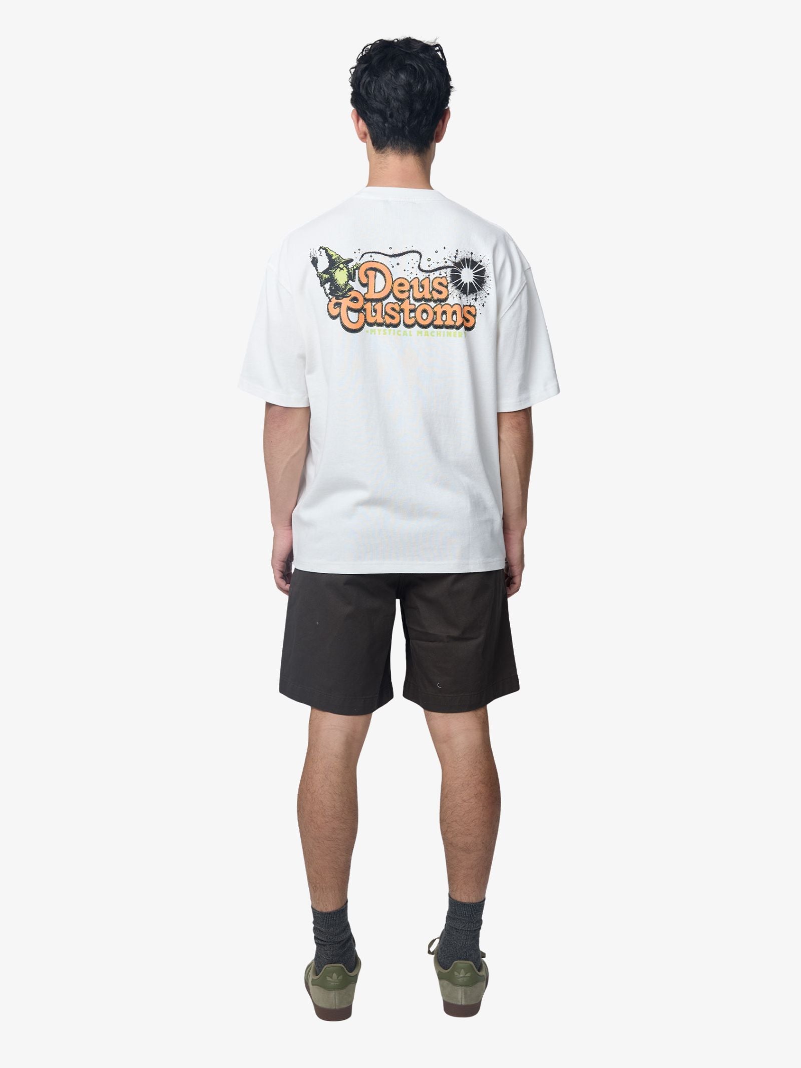 The Mystical Machine Tee by Deus is a loose-fitting, short-sleeve top featuring a small contrast graphic on the left chest that includes the word "Deus". The back features a large, vintage-inspired graphic print with the phrase "Deus Customs" in an arching, prominent font.