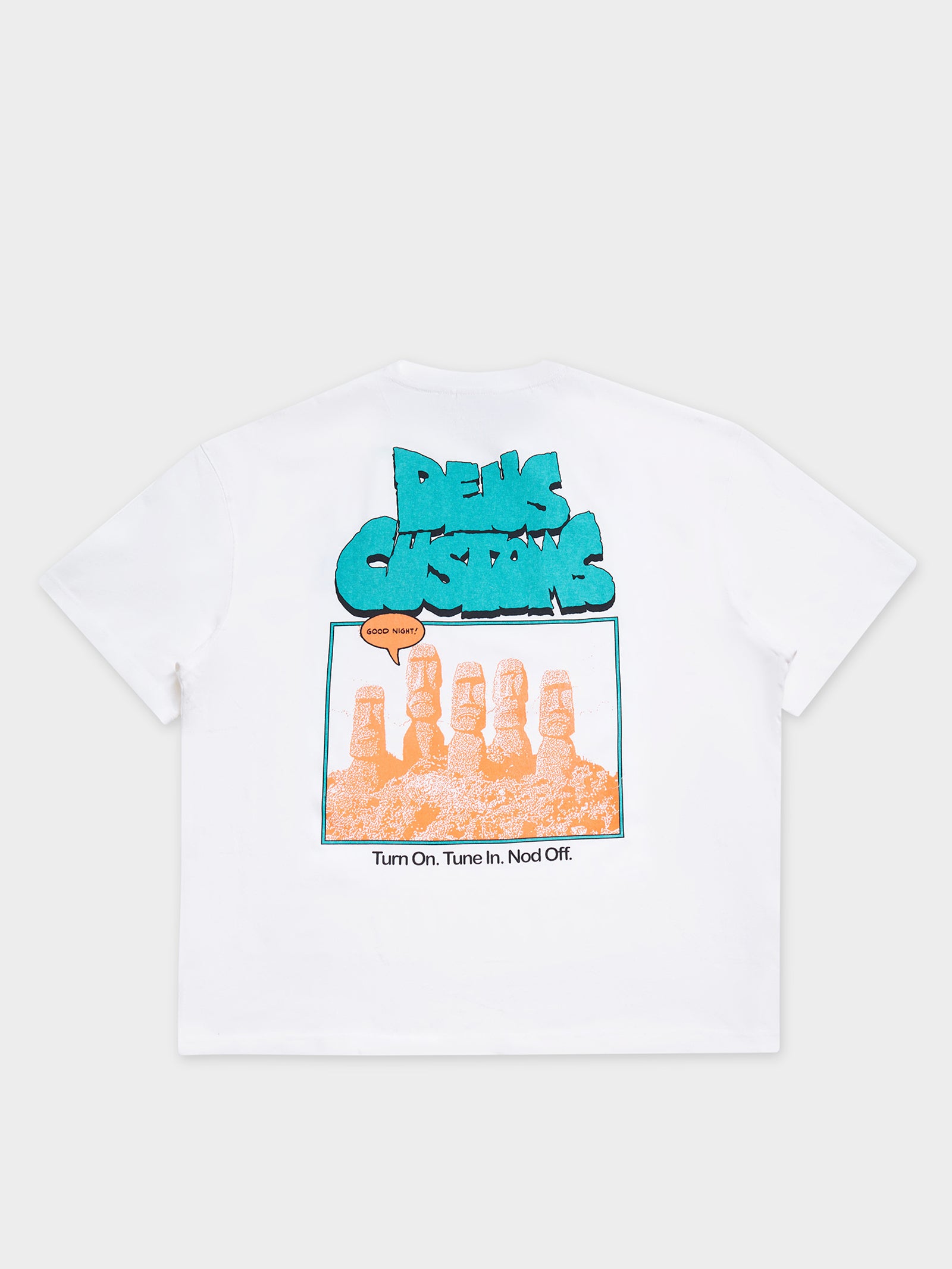 Embrace laid-back style with the Deus Nodding Off Tee in Vintage White. This short-sleeve shirt features a ribbed crew neckline for a comfortable fit and a minimalist logo on the left chest. The back boasts a bold "Turn on Tune In. Nod Off" graphic, giving this piece an effortlessly cool edge. Whether you're winding down or stepping out, this tee captures the essence of relaxed, off-duty style.