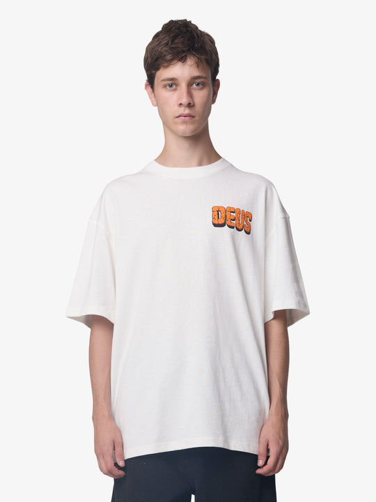 The Primitive Fuel Tee by Deus is made from heavyweight cotton jersey and features an oversized, boxy fit with a classic crew neckline. The t-shirt includes a small bubble logo graphic on the chest and a large, detailed petrol shrine graphic print with text across the back.