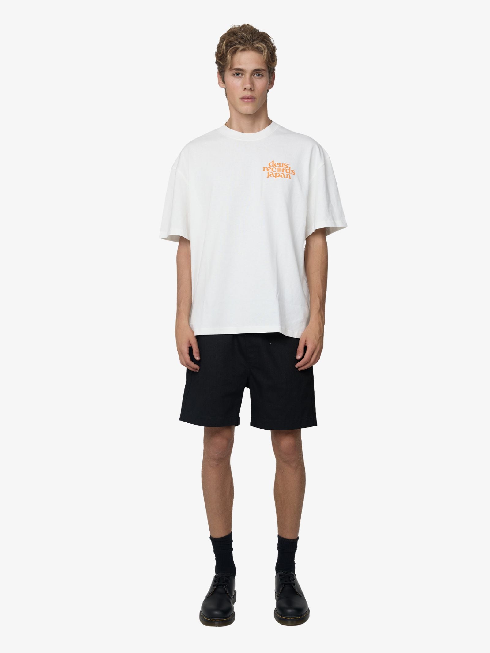 The Reverse Strata Tee by Deus is an oversized, short-sleeve top featuring bold typographic and spiral branding. This shirt includes a small "Deus Records Japan" logo on the front left chest and a large, vibrant spiral graphic with "Deus" branding printed across the back.