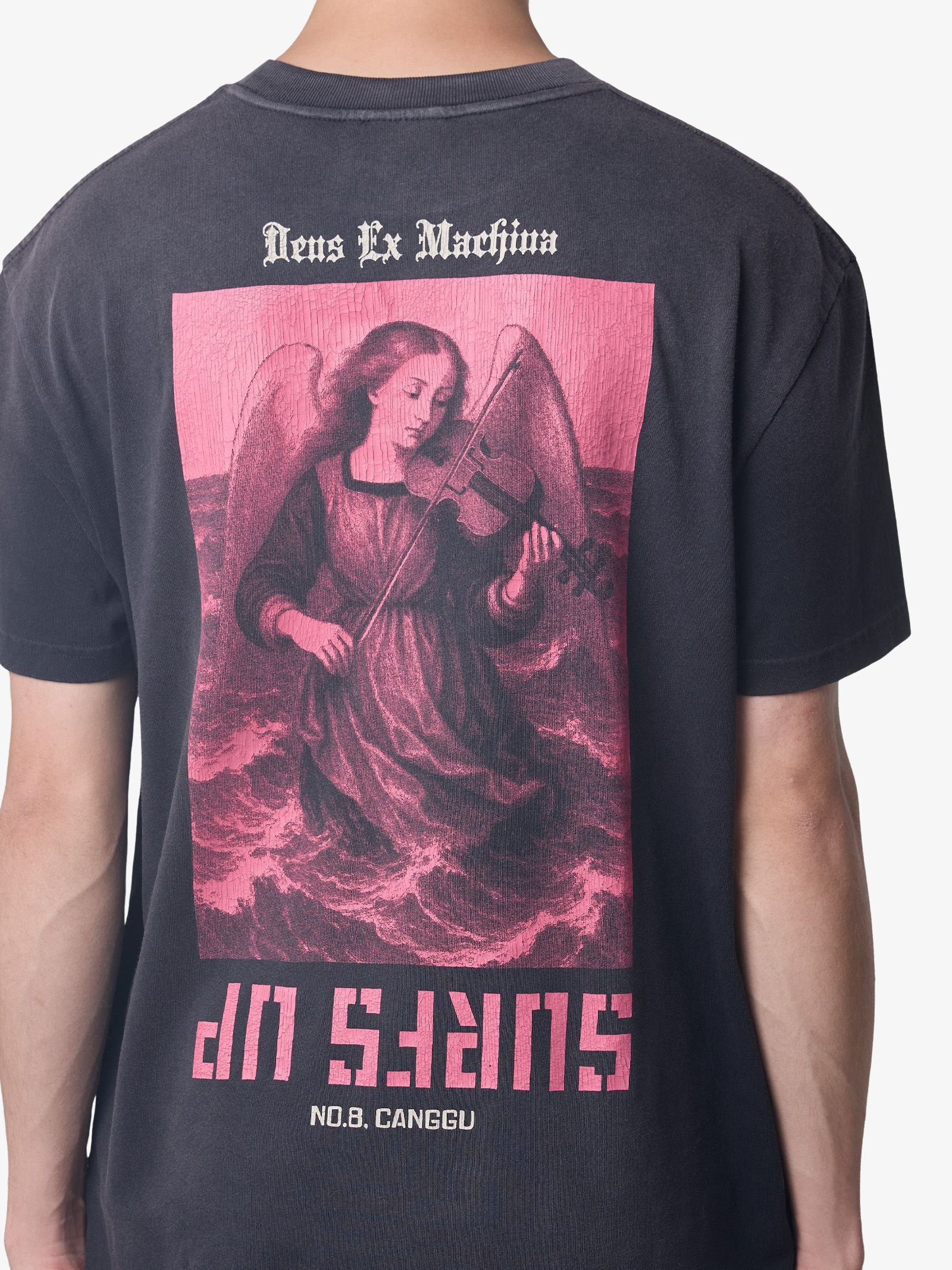 The Suffer The Surf Tee by Deus is made from heavyweight cotton jersey and features an oversized, boxy fit with a classic crew neckline. The t-shirt includes a bold graphic print detail on the chest and a large, striking angel and surf-themed graphic print across the entire back.