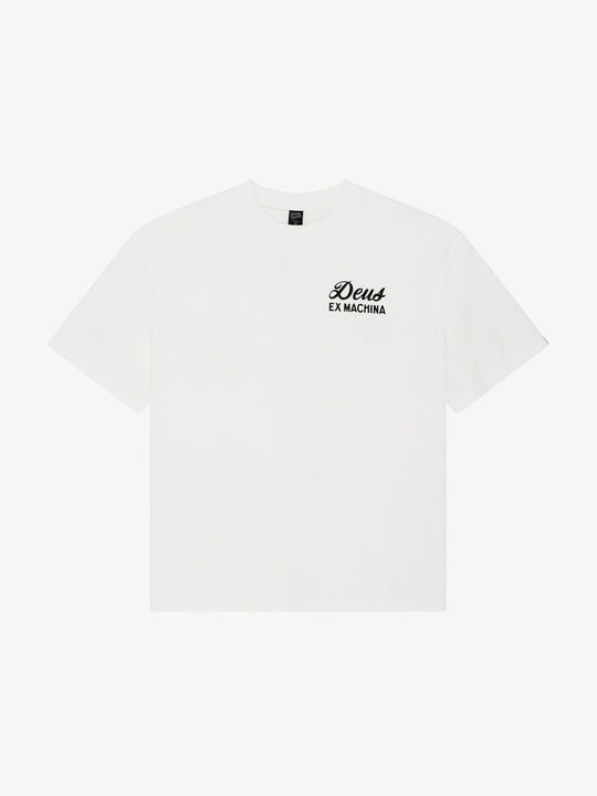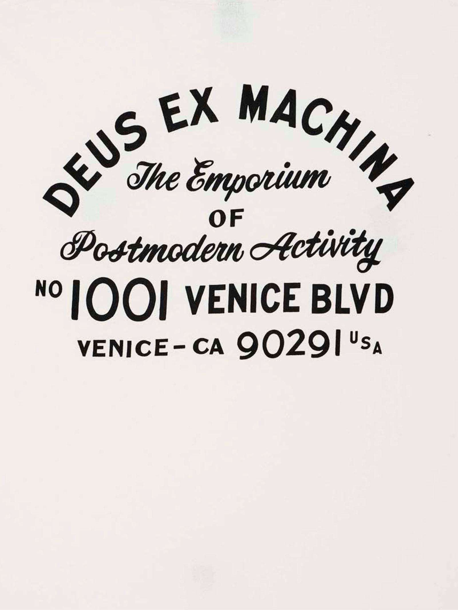 The Venice Sign Tee by Deus is a classic short sleeve t-shirt featuring a relaxed fit and heritage-inspired graphic branding. This garment is defined by a small script "Deus Ex Machina" logo on the left chest and a large-scale address graphic centered across the rear.