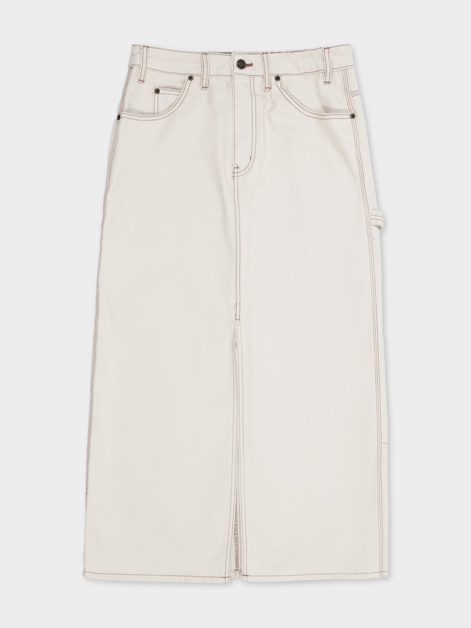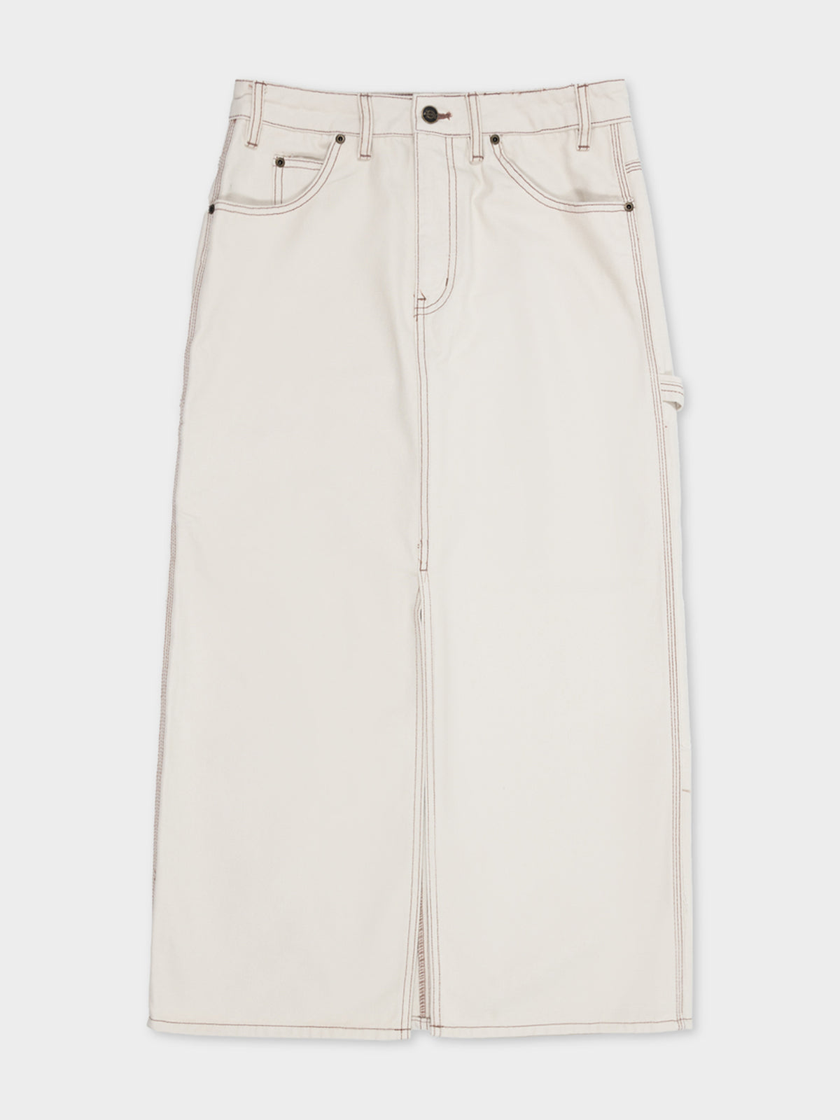 Channeling timeless workwear appeal, the 1996 Mid Carpenter Skirt by Dickies ,combines heritage style with modern versatility. Crafted in a sleek bone hue, this midi-length skirt features a classic five-pocket design for functionality and effortless charm. The button and zip closure ensure a secure, comfortable fit, making it a perfect blend of practicality and style.