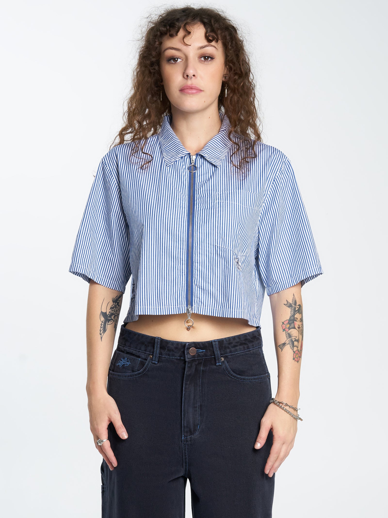 Stay comfortable and stylish in our Die Laughing Box Fit Shirt. With a zip through design and embroidered details, this woven shirt offers a cropped fit for a trendy look. Made with a box fit, it's perfect for any occasion.