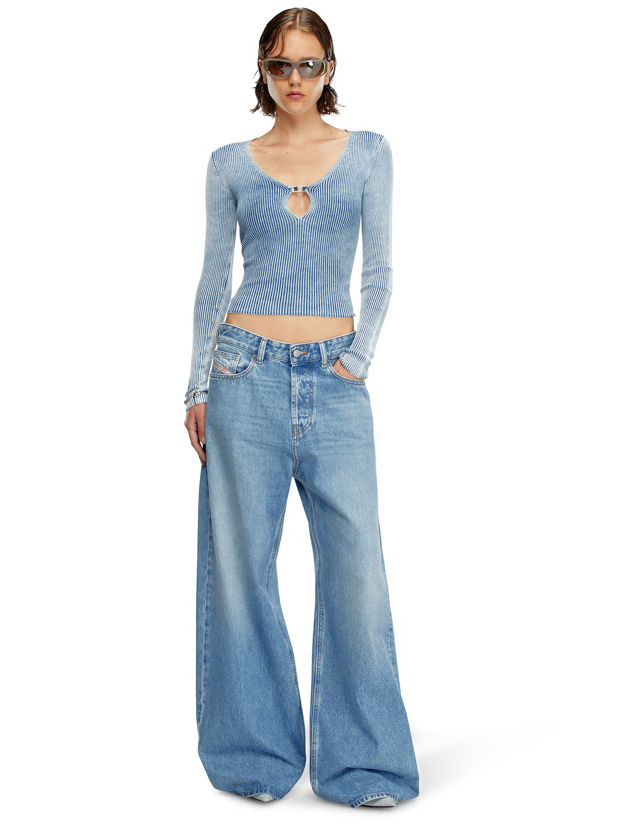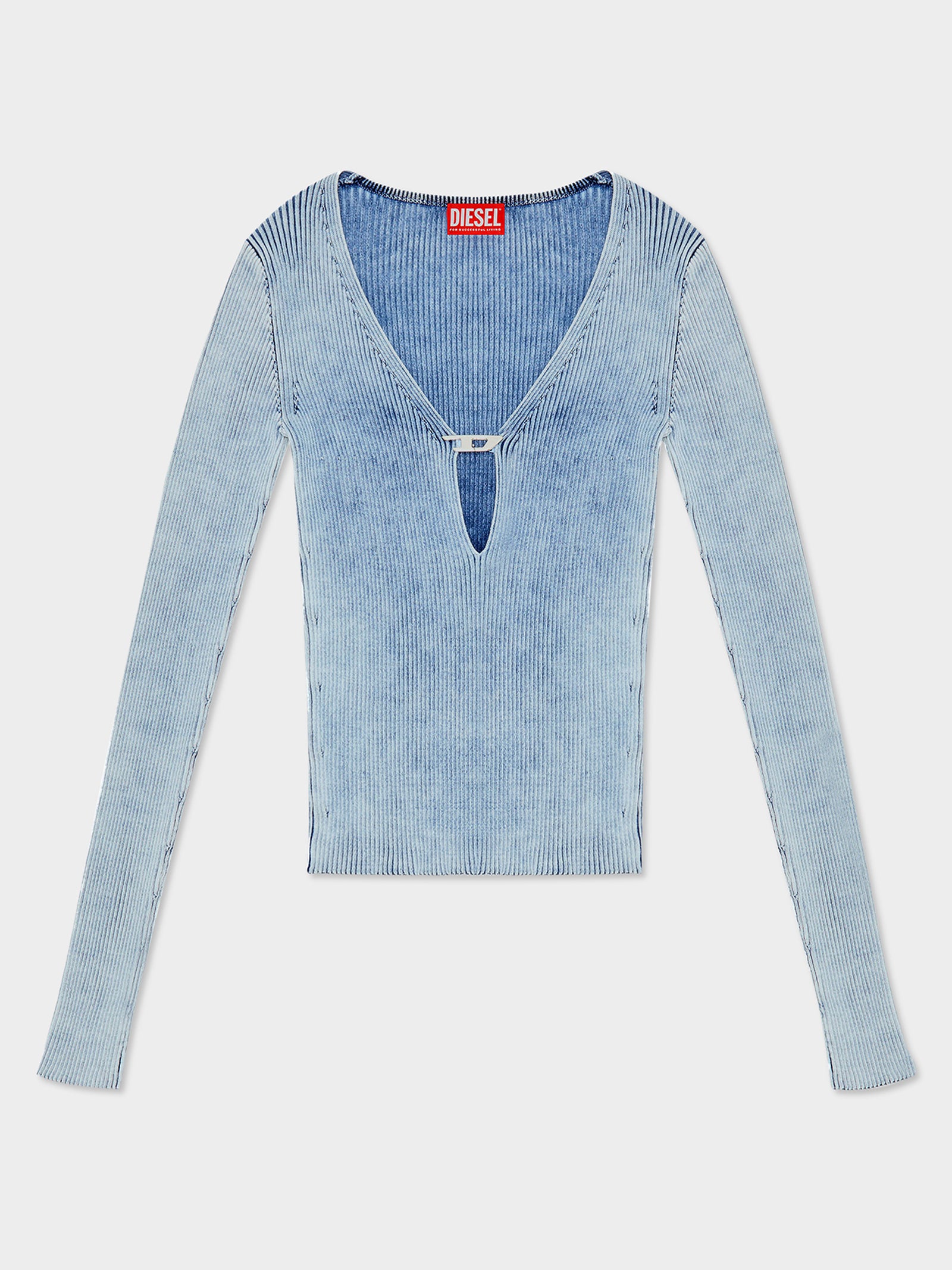 The Diesel M-Teri Knitwear is a bold, long-sleeve top featuring a deep neckline with a keyhole cut-out, pinched together by a metal D plaque. Knitted from indigo-dyed cotton yarns, this piece showcases an icy blue wash with a marbled 'spider web' effect. The ribbed knit ensures a flexible, close fit, merging modern design with Diesel’s signature luxury and craftsmanship.