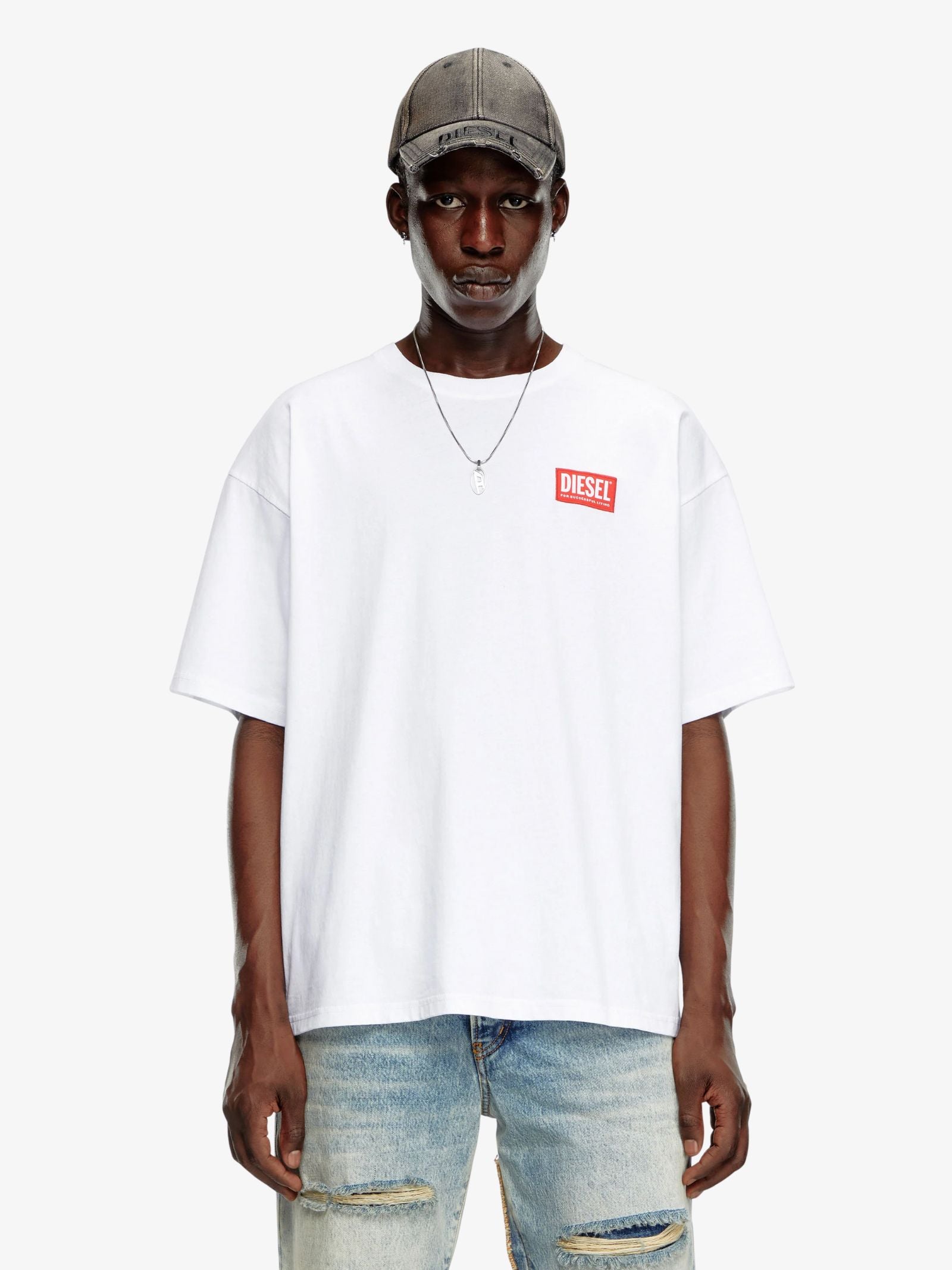 The Men's T-Boxt-Lab T-Shirt by Diesel is a relaxed-fit staple defined by a clean white organic cotton jersey construction and a slightly boxy silhouette. This piece is visually characterized by its slightly textured 'raw' feel and a vibrant red jacquard logo patch appliquéd on the left chest.