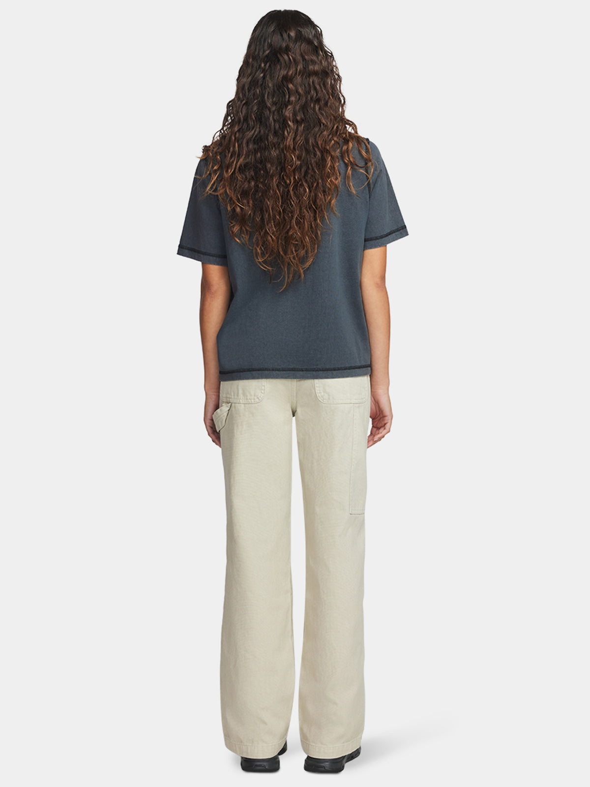 The Double Knee Carpenter Pant is a relaxed fit pant made from 100% cotton heavyweight canvas. It is designed with a reinforced waistband and triple stitched leg seams for durability. Featuring knee panels, star-shaped rivets and a Larriet shank button. The pant undergoes a specialized dyeing technique to create its distinctive, aged appearance. It includes zip fly, front rounded pockets, a coin pocket, and two back patch pockets. Additionally, it offers a hammer loop, utility pocket and the Larriet Sun woven label.
