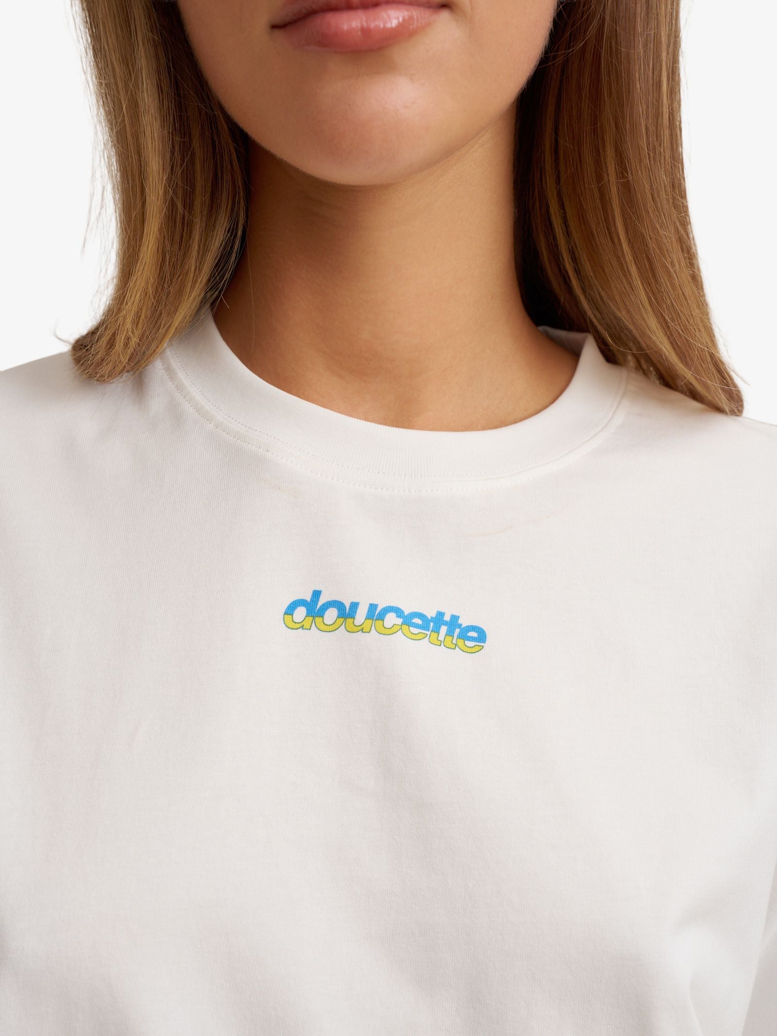 The Unisex Butterfly Compact Tee by Doucette is a heavyweight, relaxed-fit staple crafted from premium cream-colored cotton jersey. This tee features a minimal "doucette" logo on the center chest in blue and yellow, complemented by a large vibrant butterfly graphic and bold branding across the back.