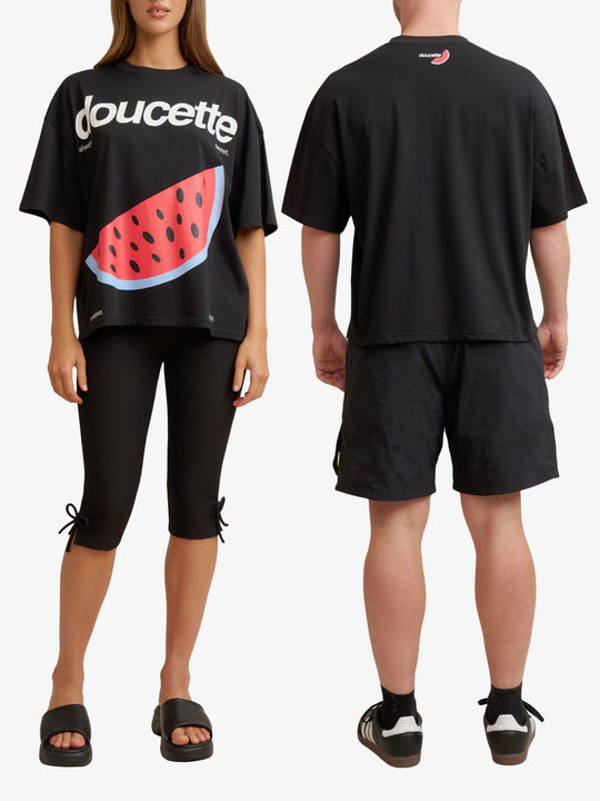 The Unisex Watermelon Love Compact Tee by Doucette is a heavyweight, relaxed-fit staple crafted from premium black cotton jersey. This tee features a bold graphic of a watermelon slice on the front alongside large "doucette" branding, with a smaller corresponding logo on the back neck.