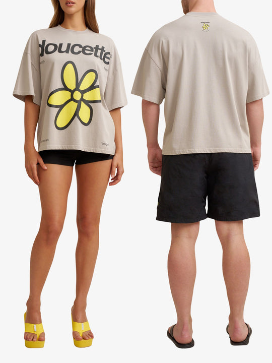 The Unisex Wildflower Compact Tee by Doucette is a heavyweight, relaxed-fit staple crafted from premium heavyweight cotton jersey. This tee features a minimal "doucette" logo on the center chest alongside a small yellow flower, complemented by a large-scale vibrant yellow floral and branding graphic across the front. The design is finished with a small branded logo print on the back neck.