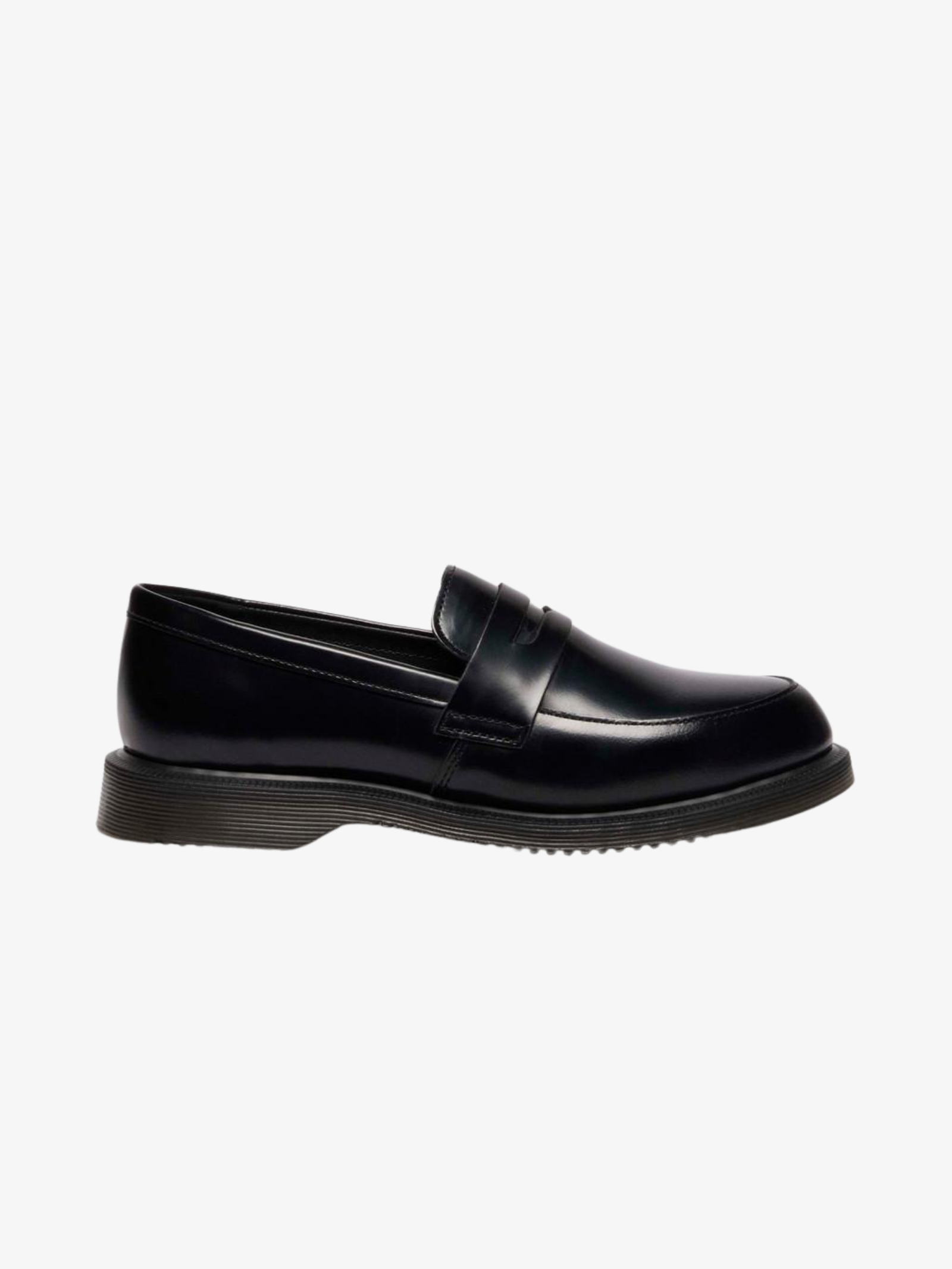 The Temara Loafer by Dr. Martens is crafted from smooth leather. This loafer features monochrome stitching, a plain welt and a smoke DMS sole.