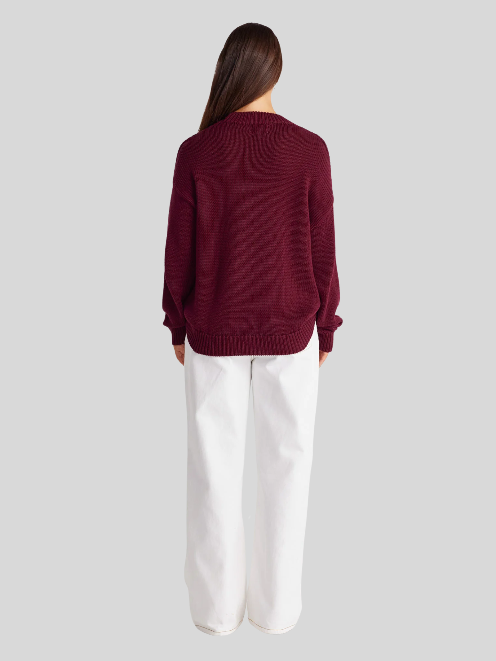 The Elm Crew Knit in Cabernet by SNDYS is an oversized jumper that features a crew neckline adorned with delicate cable detailing, ribbed cuffs and hem.