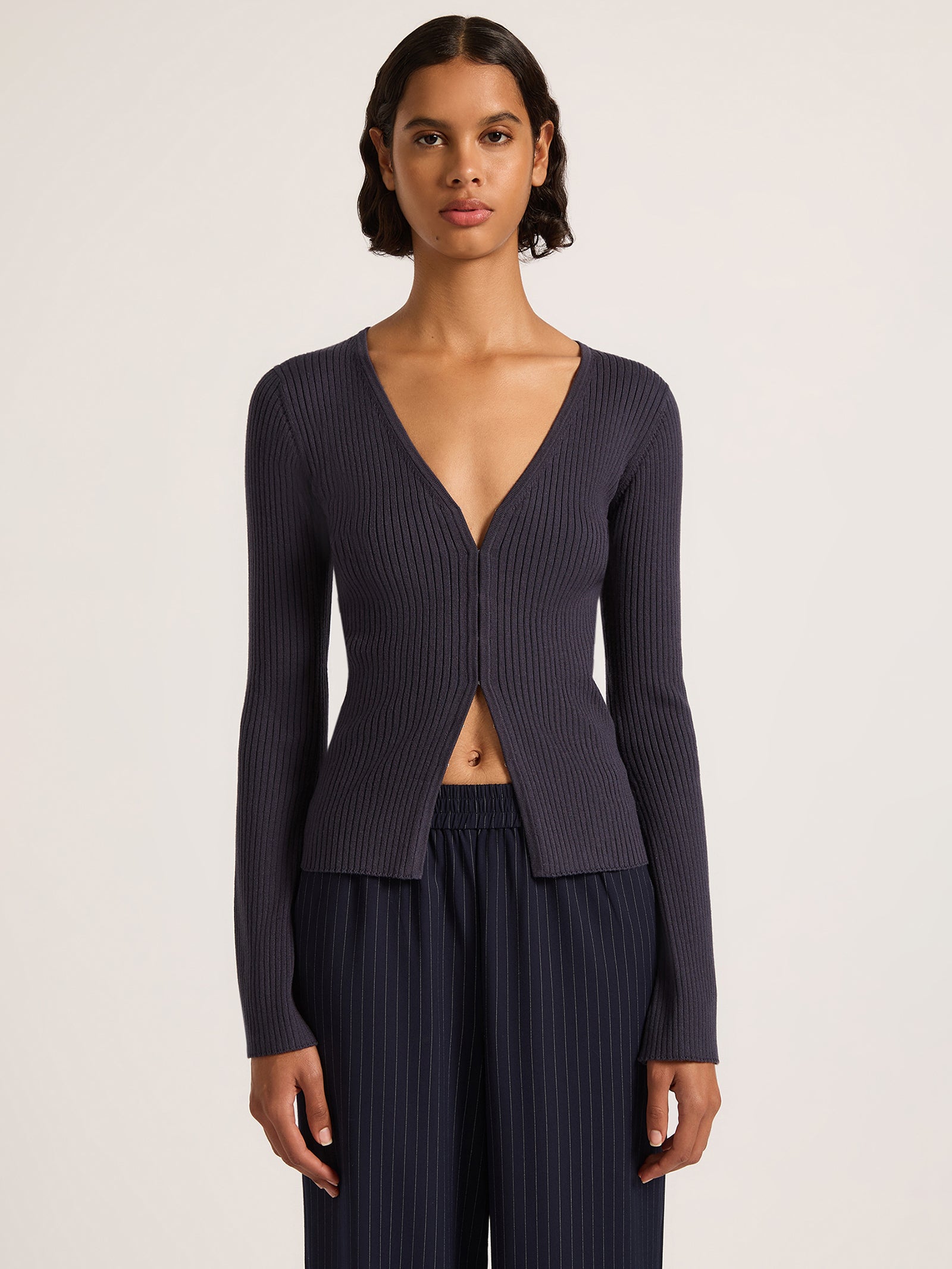 The Ettiene Knit Cardigan is crafted from a cotton blend yarn for a ribbed texture and soft touch. Designed with a fitted silhouette, it features flared long sleeves and a V-neck, complemented by a hook and eye closure at the center front. Made of 45% acrylic, 37% cotton, and 18% nylon, this cardigan is both comfortable and stylish.