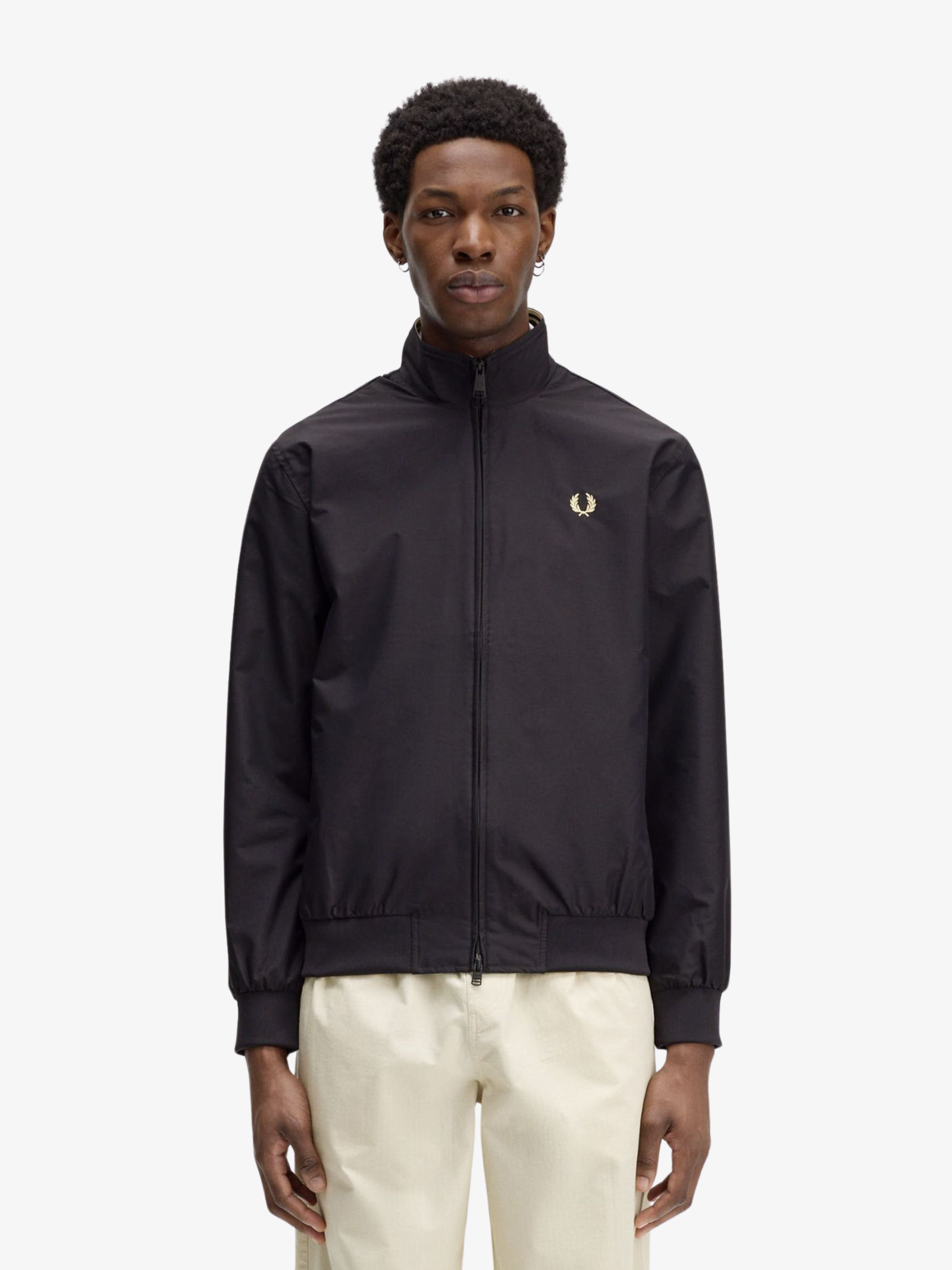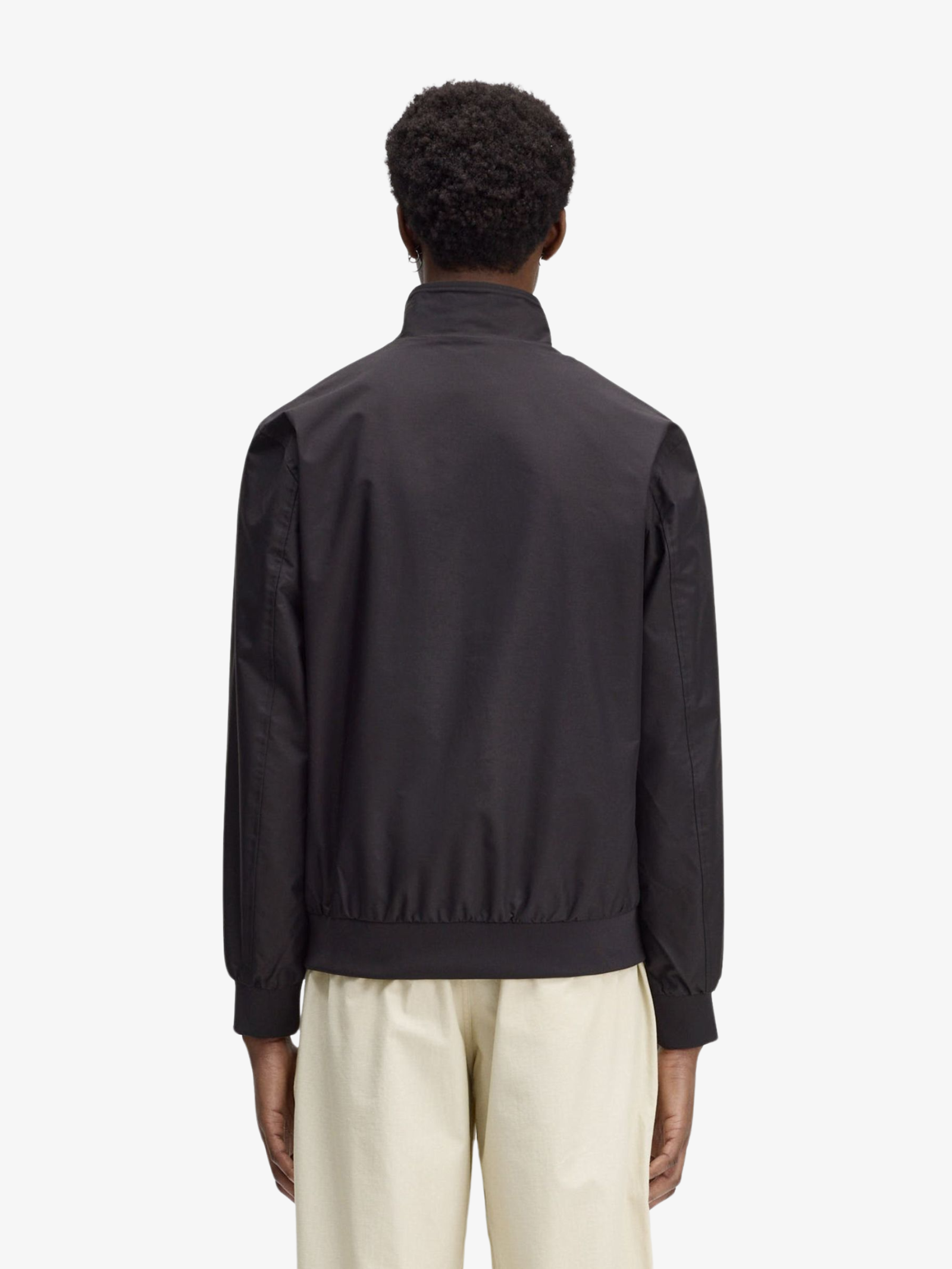 The Brentham Jacket in Black by Fred Perry is crafted from durable recycled nylon twill. This lightweight jacket features weather-resistant protection.