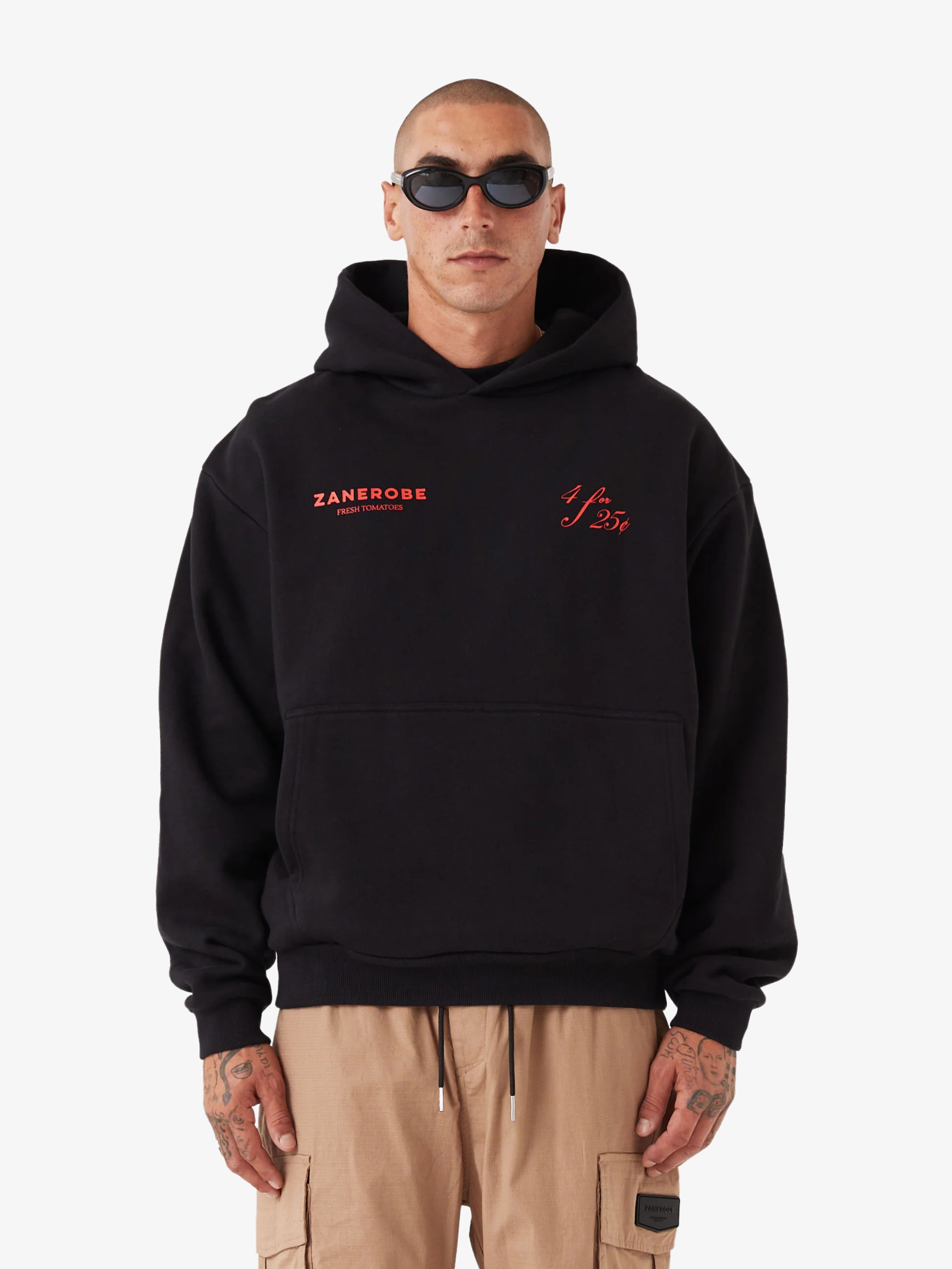 The Fresh Product Box Hood in Black by Zanerobe is crafted from premium brushed fleece. This hoodie features a relaxed fit, tonal box logo prin, drop-shoulder design and ribbed trims.