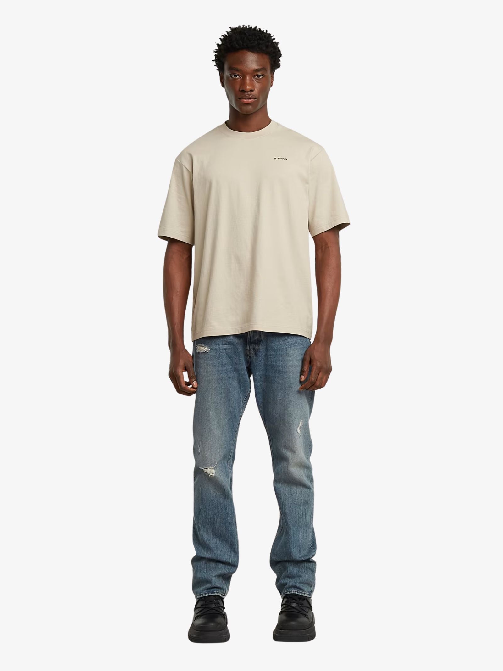 The Boxy Base T-Shirt by G-Star features an oversized fit with short sleeves and a subtle graphic detail. It has a round neck and regular length. This shirt is made from a blend of organic and recycled cotton and is a heavyweight comfort stretch fabric.
