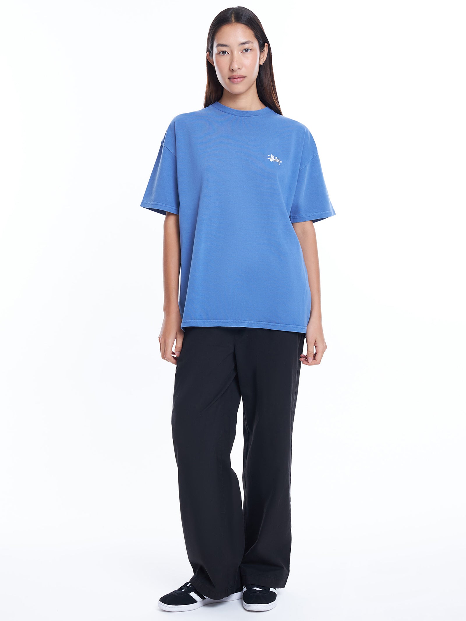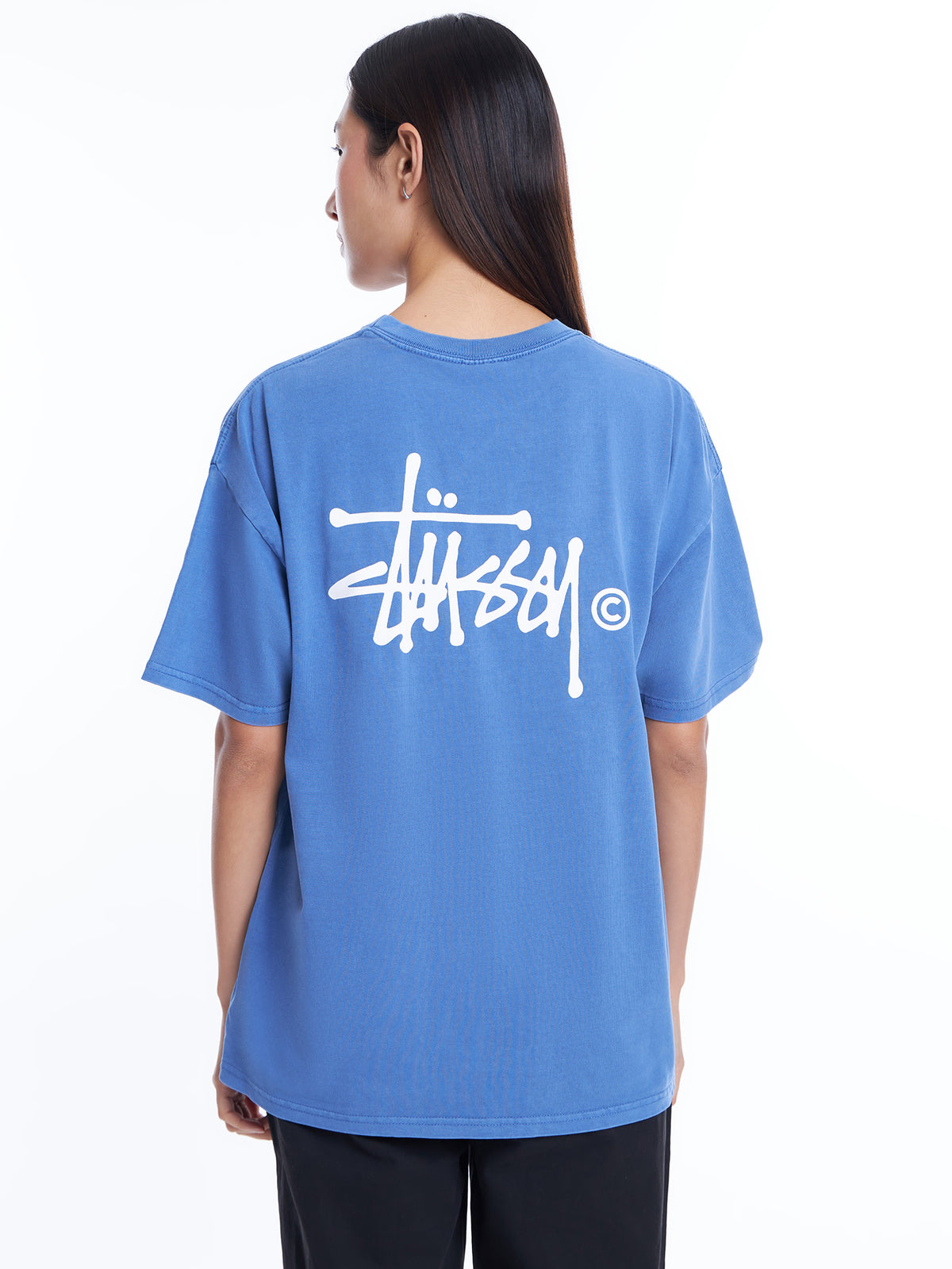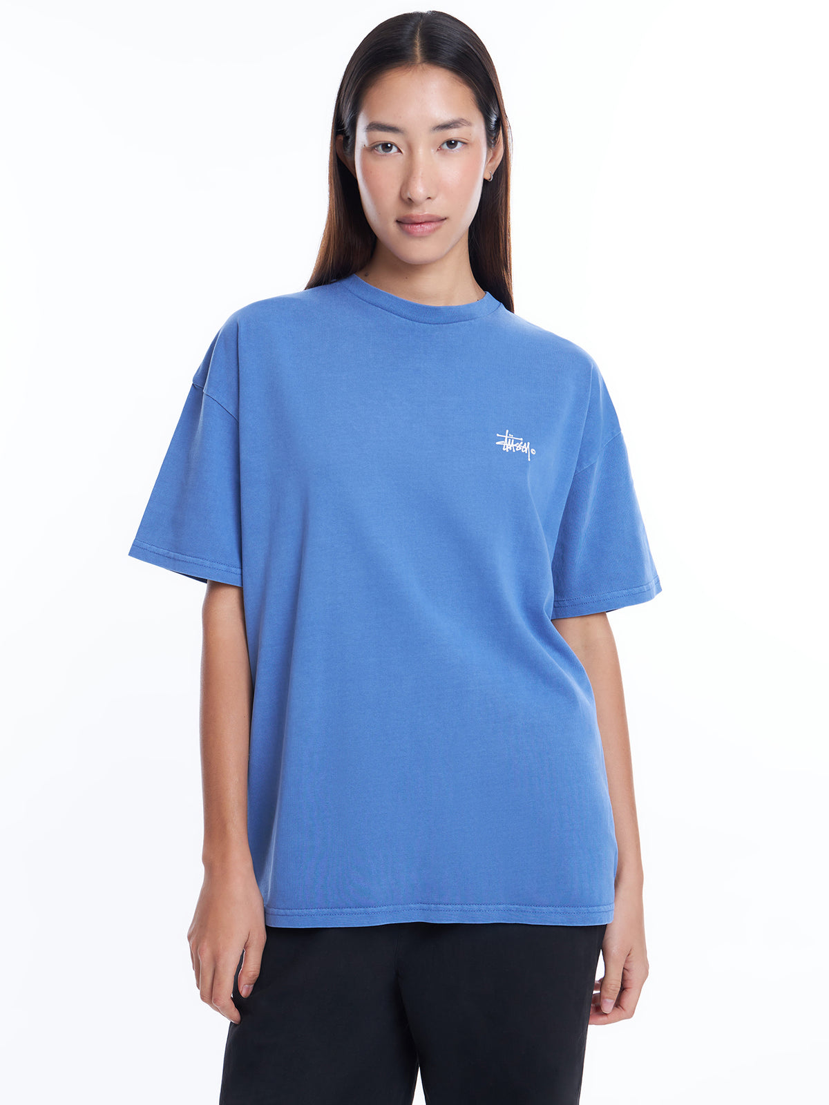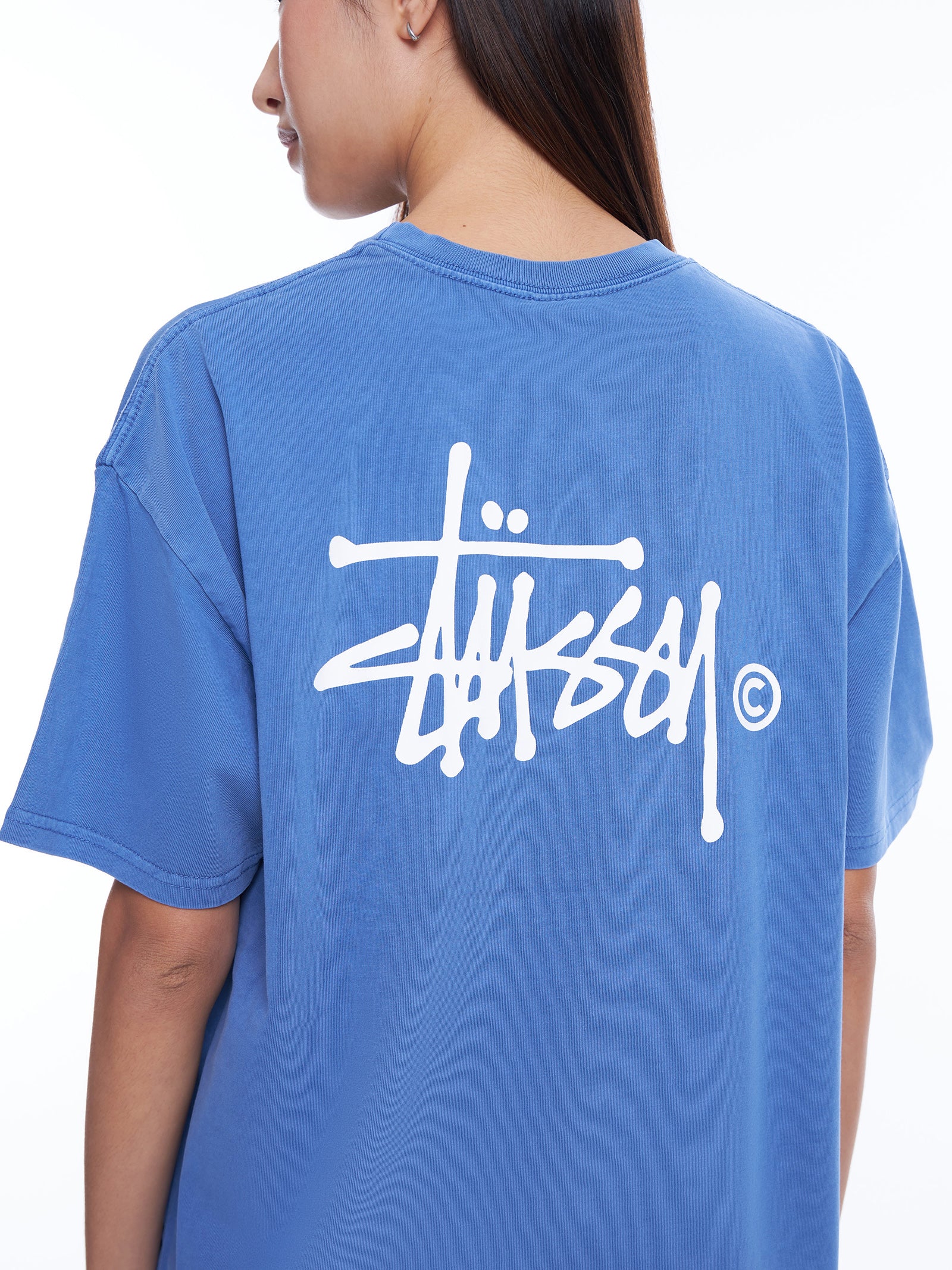 This relaxed fit, washed blue tee features short sleeves, a ribbed crew neckline, and a logo on the back and left chest. Made with 100% cotton materials.