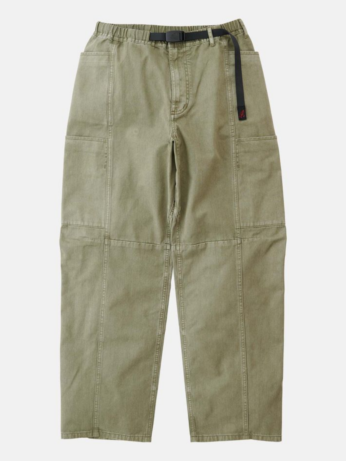 The Voyager Pant in Herb Pigment by Gramicci is crafted from 100% organic cotton twill. These pants feature a relaxed, tapered fit with an elastic waistband, large wrap-around pockets and lower thigh pockets.