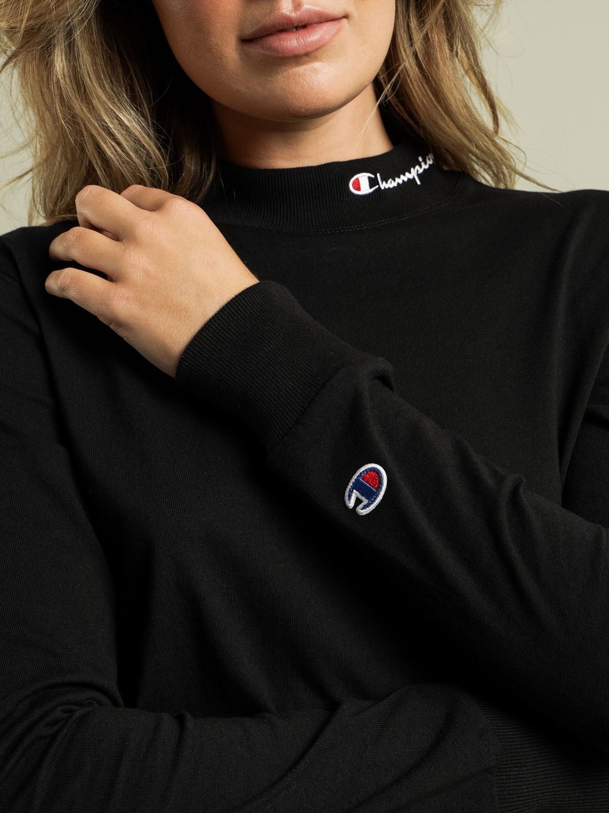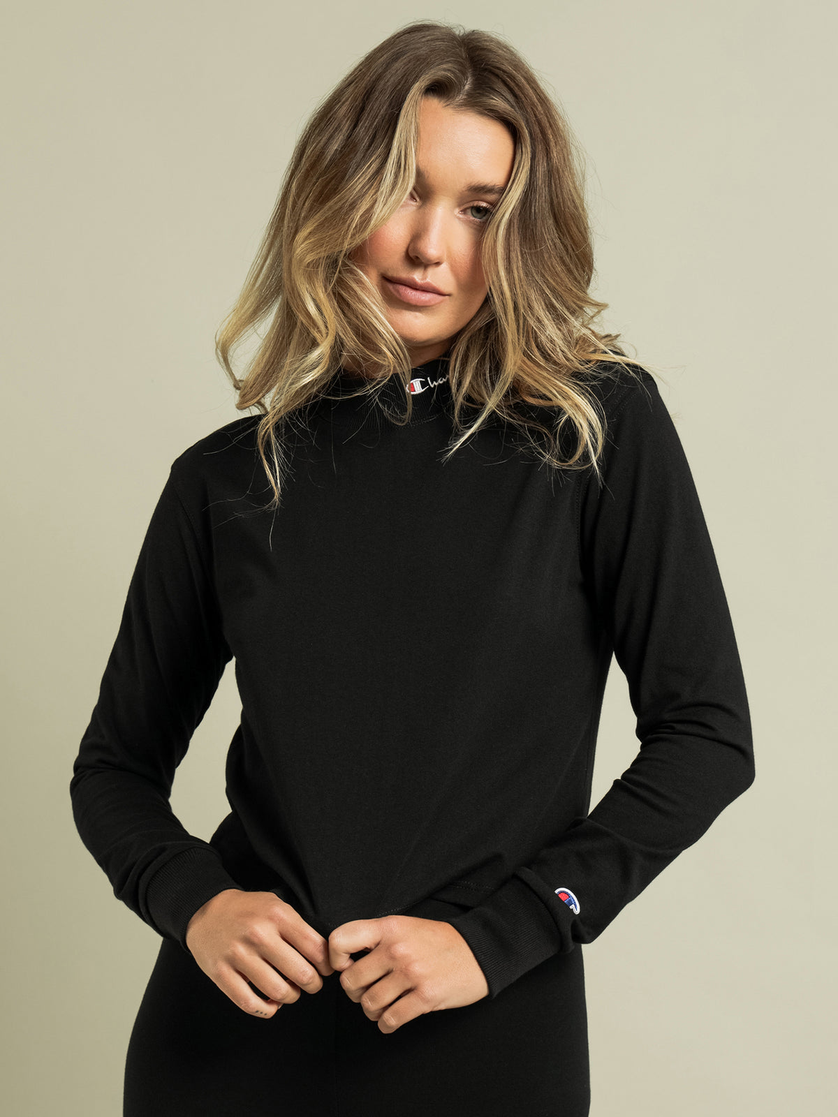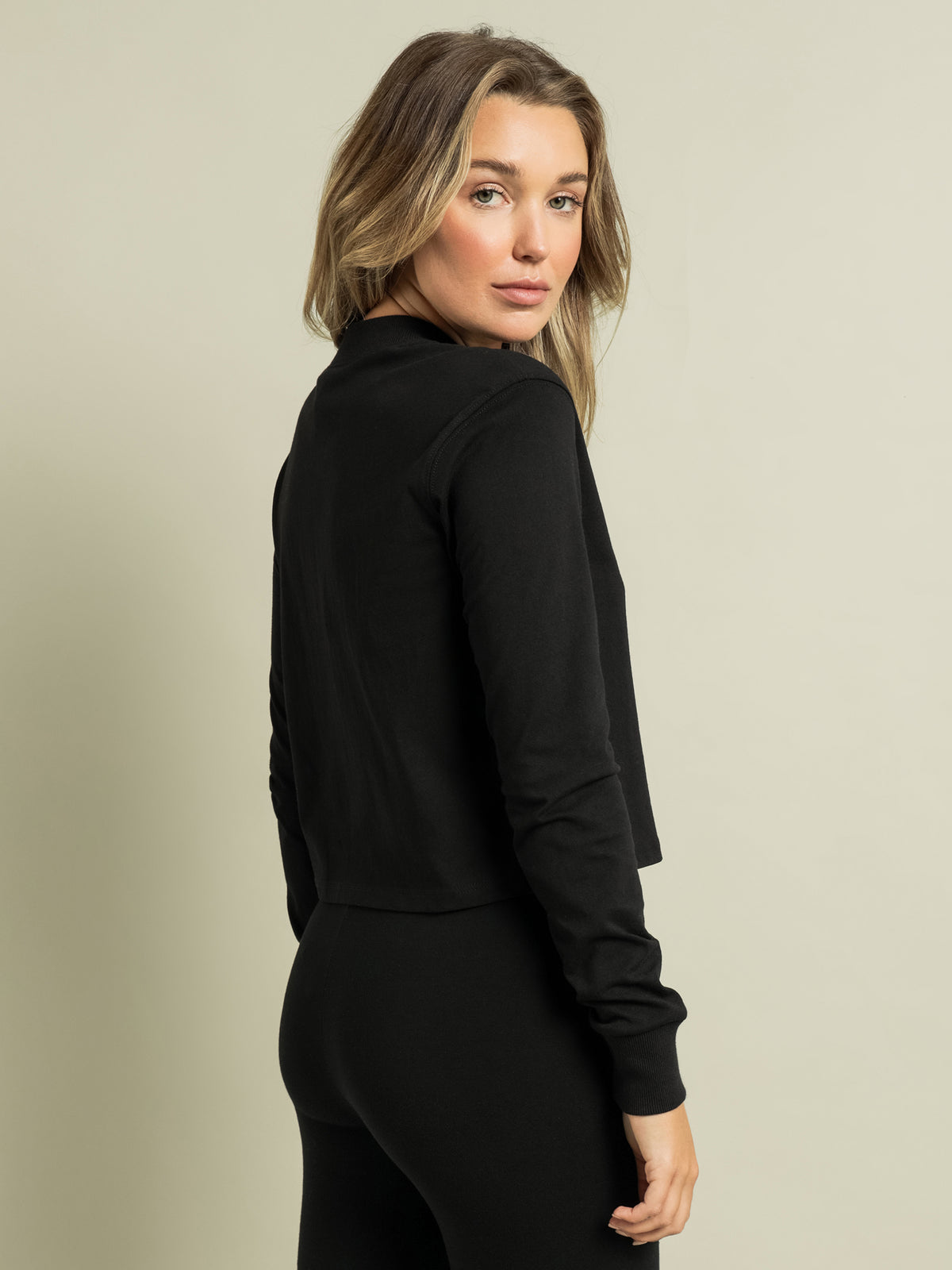 This has to be the most comfortable simple black long sleeve I have! The high neck line gives me the ability to dress it up or down for work.