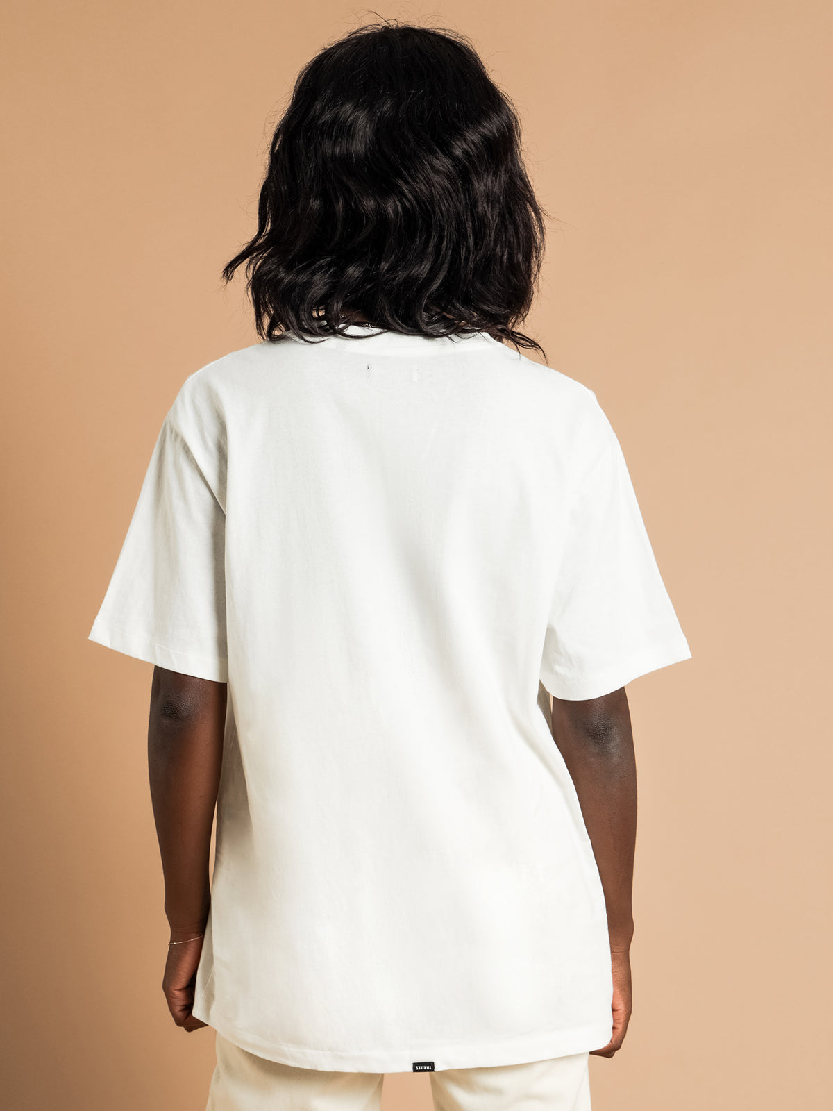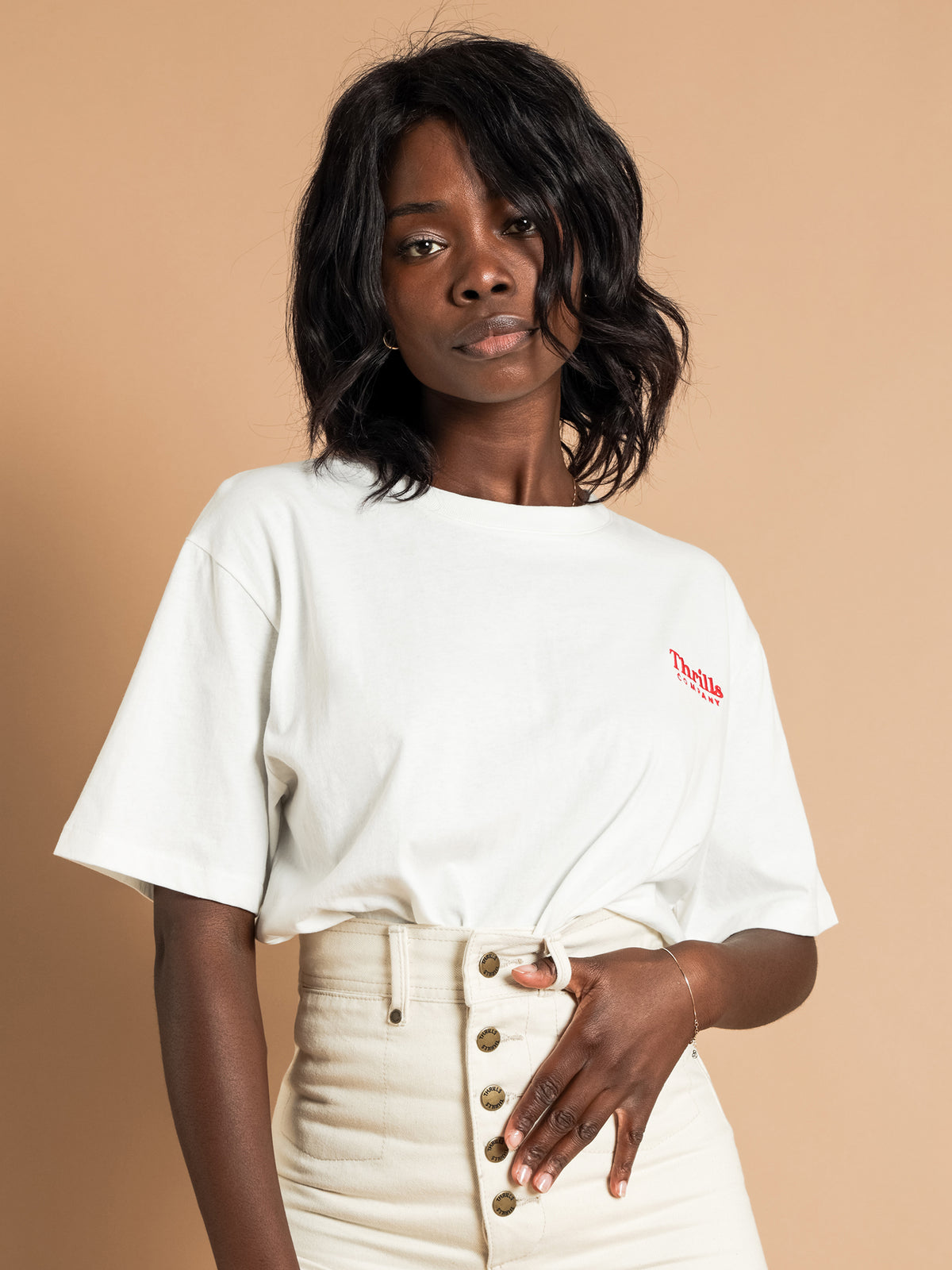 thicker/heavier cotton - durable and keeps its shape however is a bit hotter. oversized fit but i'd say runs on the larger size even for this