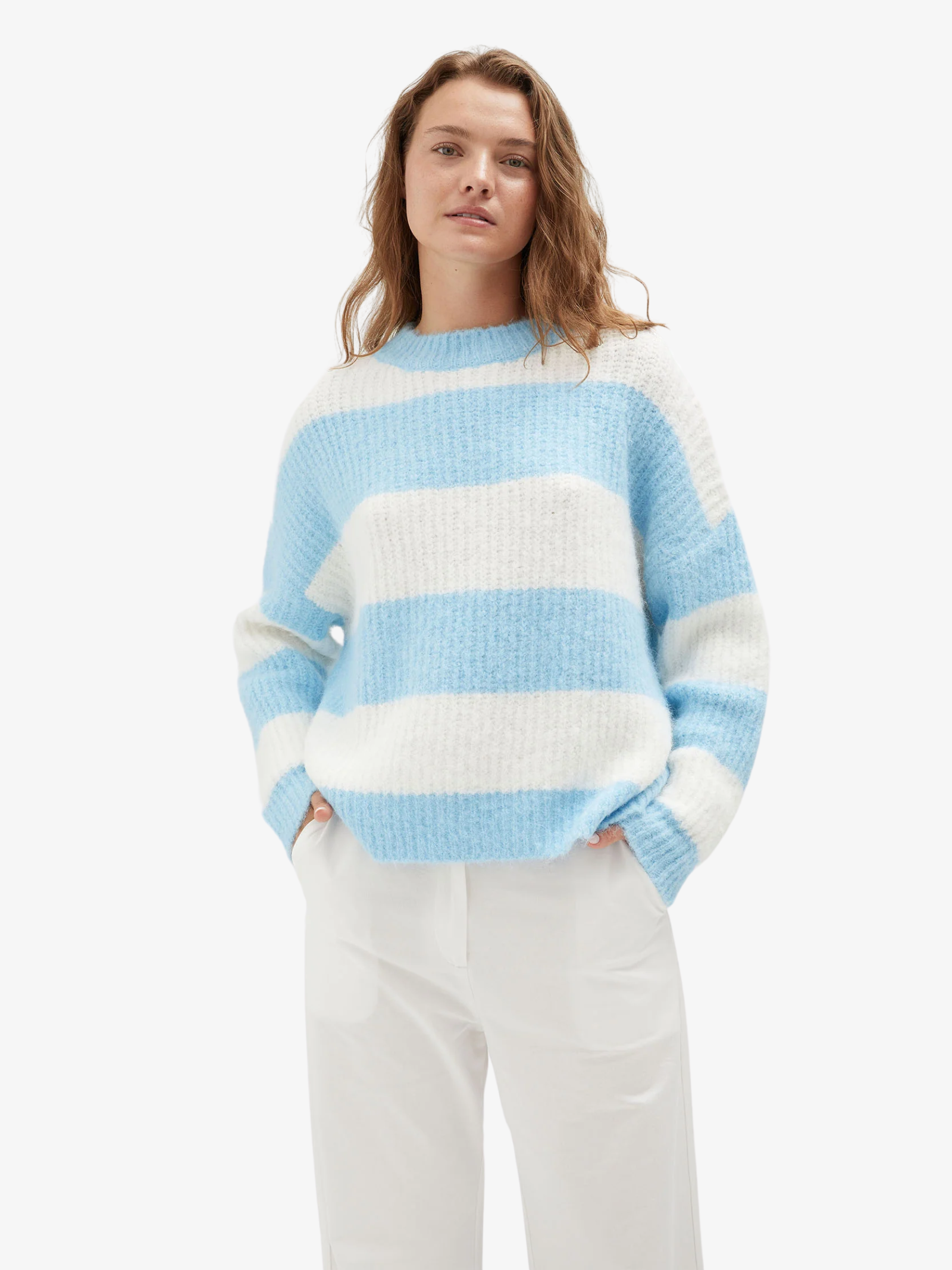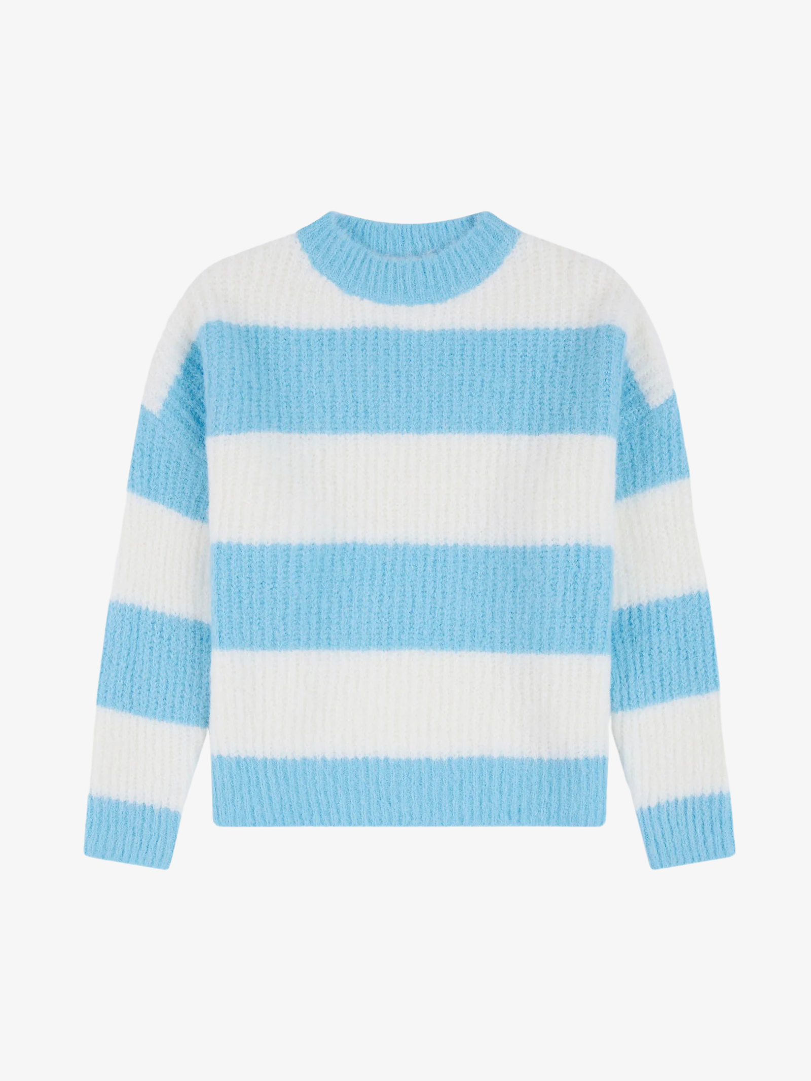 The Striped Knit Jumper in Blue/White by Holiday Shop is crafted from a soft and super-fluffy wool-blend fabrication. This jumper offers both warmth and comfort.