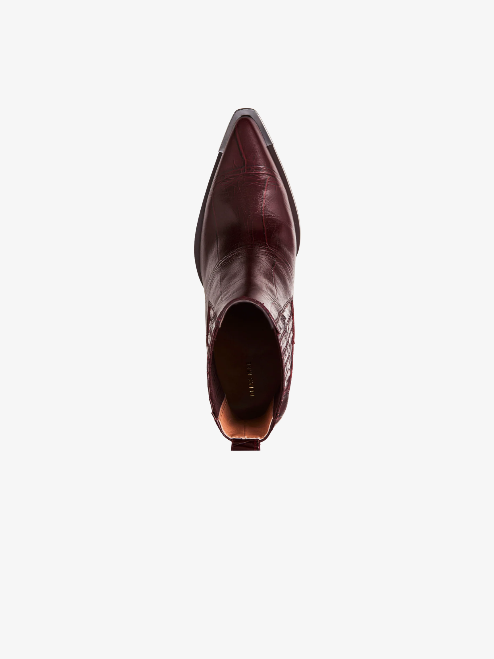 The Jessie Boot from Alias Mae delivers a bold take on a classic western silhouette. Crafted from premium leather with a rich burgundy croc-embossed finish, this ankle boot features a sleek pointed toe and a stacked 8cm heel for confident elevation.