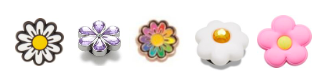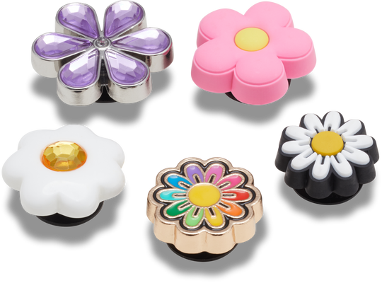 The Daisy Mix 5 Pack by Jibbitz brings a cheerful blend of color, texture, and shine inspired by playful floral designs. Each charm features a distinct daisy style, ranging from soft matte finishes to glossy gem-accented details. The mix of pastel tones, bold outlines, and metallic touches creates visual contrast without feeling crowded.