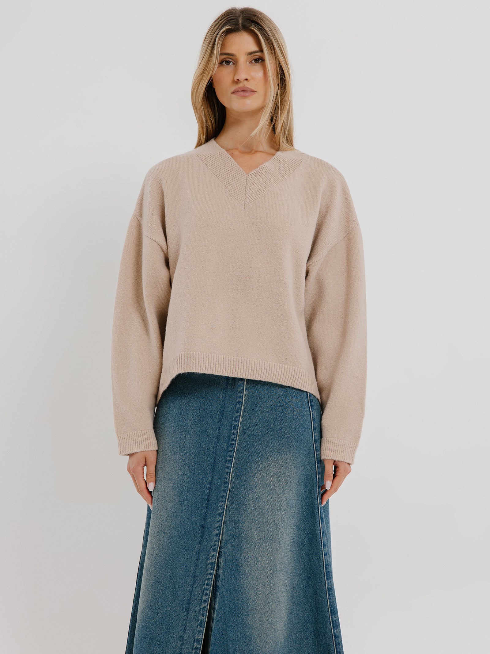 The V-neckline boasts a generously ribbed design, while the dropped shoulders and cropped, boxy fit create a wide and relaxed silhouette. This sweater is perfect for those looking for a comfortable and stylish look.