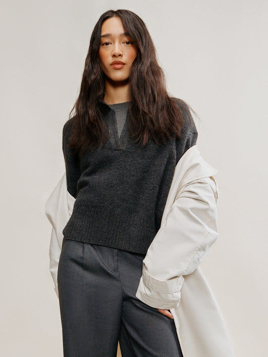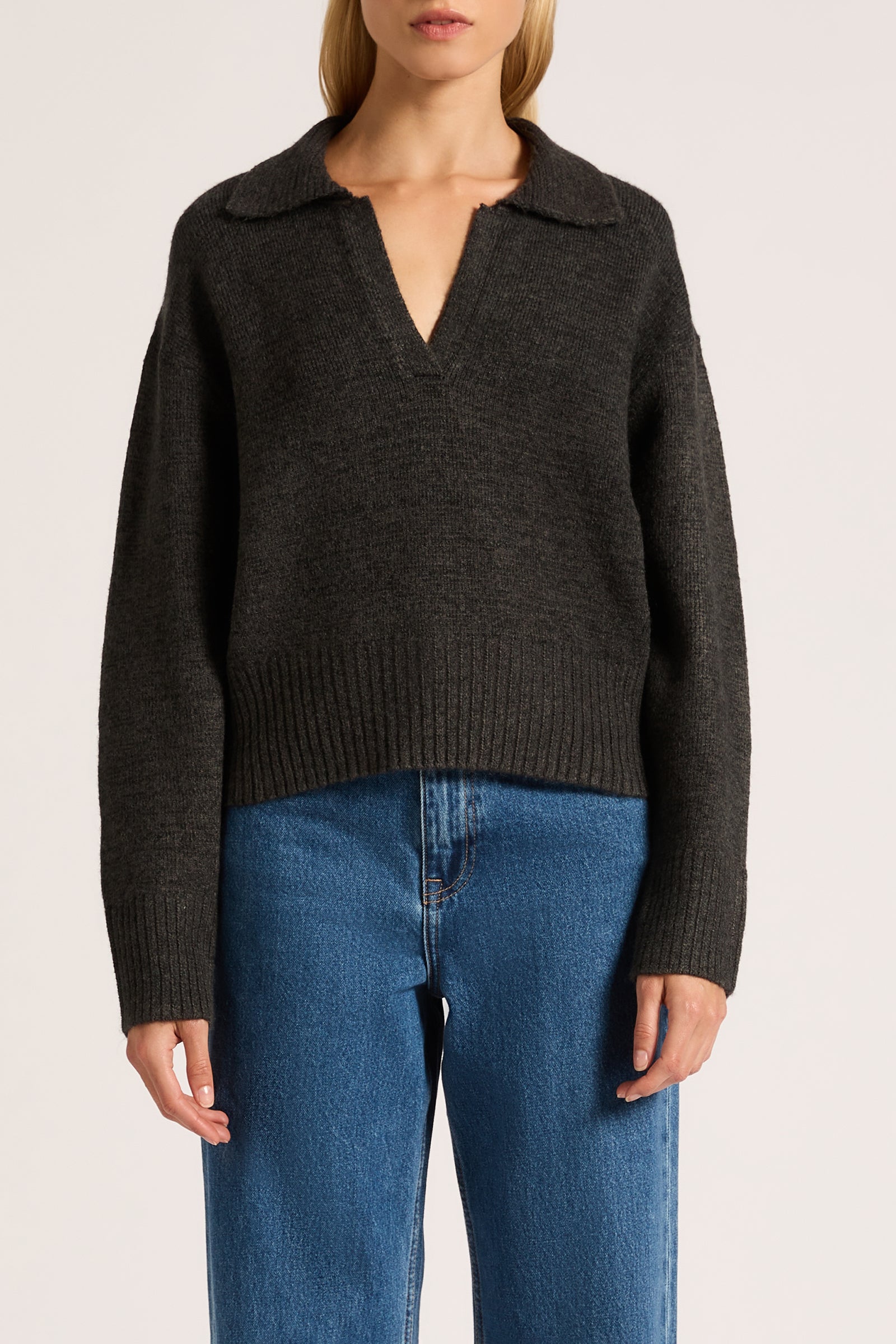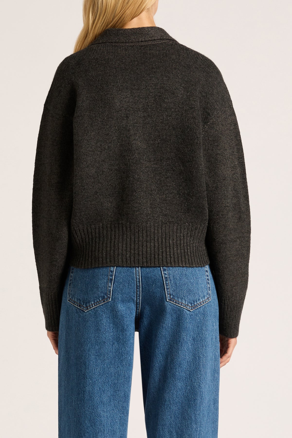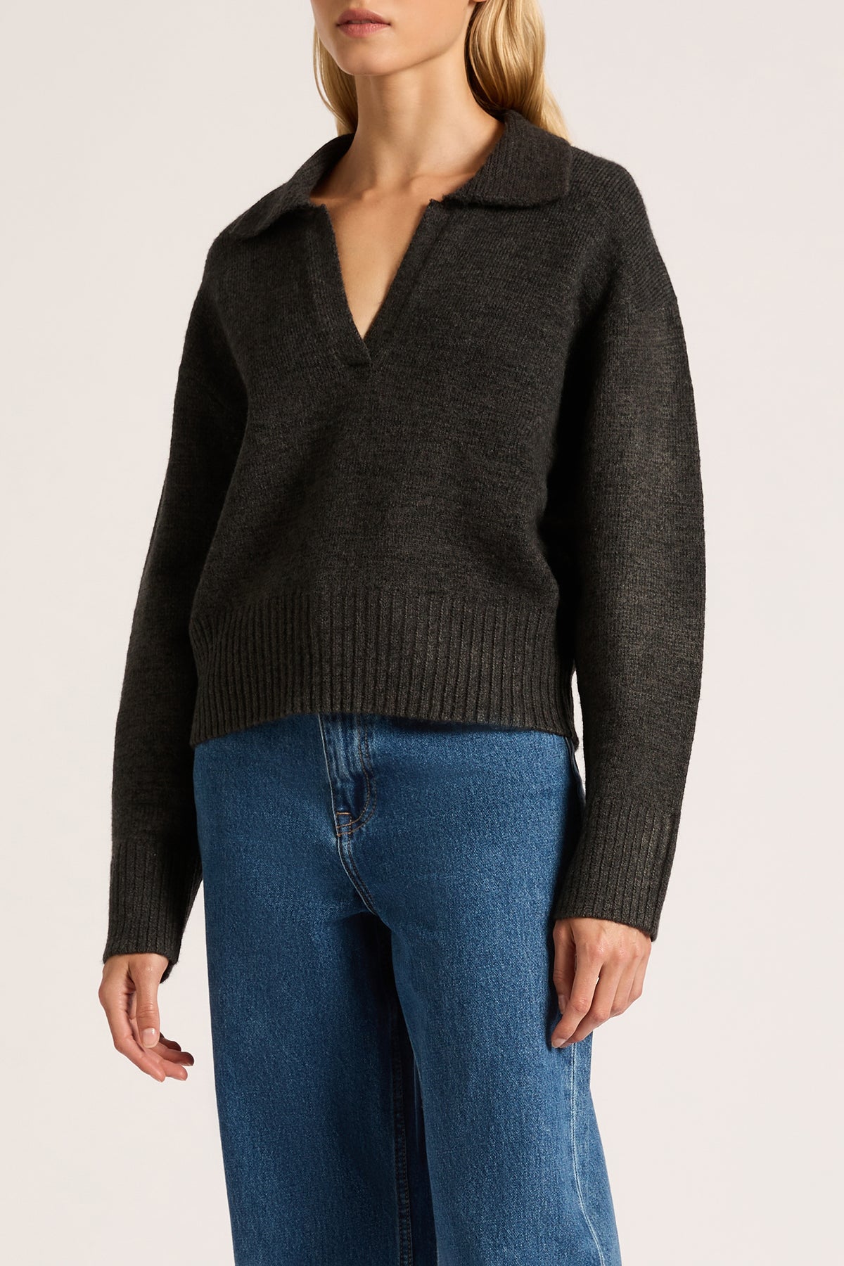 The Kinsley Rugby knit is made from a premium fluffy yarn with an extra soft hand feel. The silhouette is relaxed with long sleeves and length finishing at the hips. Features include a fully knitted rugby collar and a ribbed hemline and cuffs.