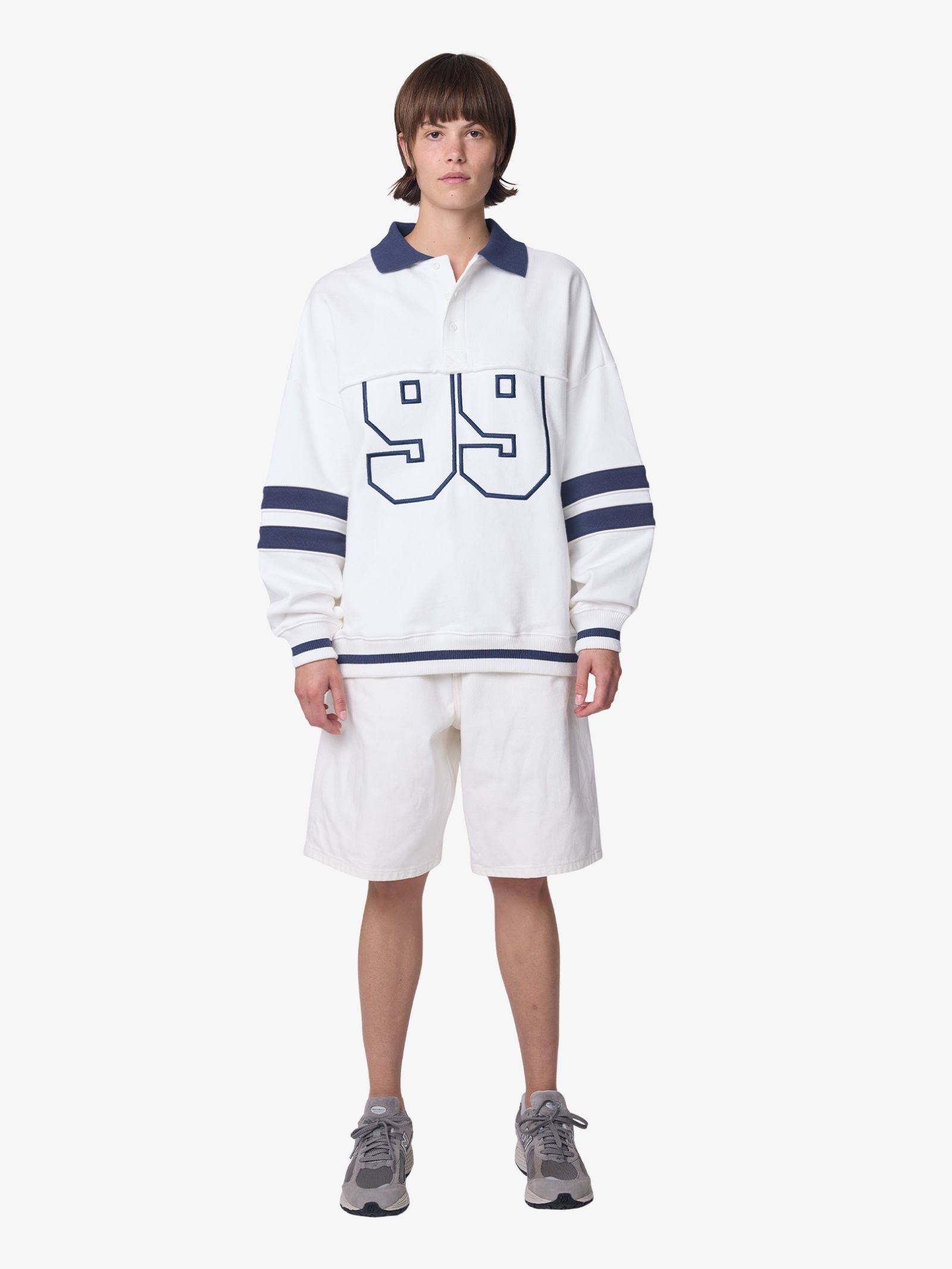 The 99 Boyfriend Polo Sweatshirt from Ksubi is an oversized rugby polo in heavyweight brushed cotton fleece with dropped shoulders, contrast collar, and striped sleeve panels. Finished with a raw-edge yoke seam, bold '99' embroidery, back logo embroidery, and Ksubi’s T-box branding.