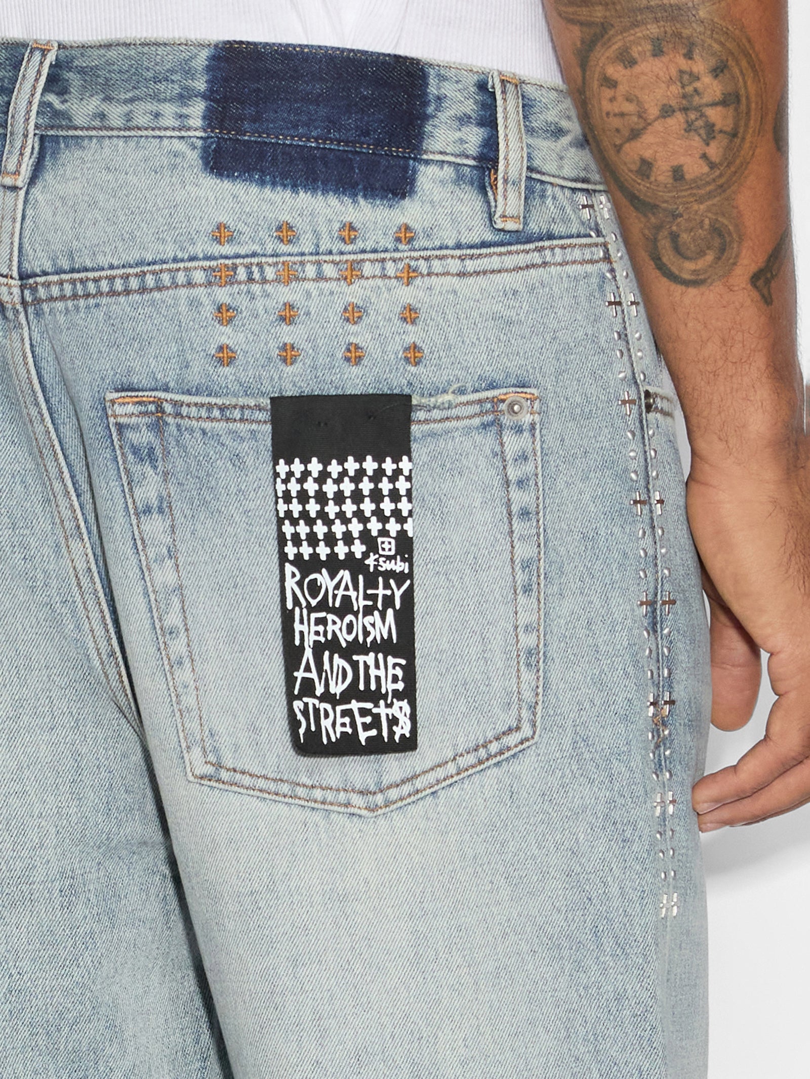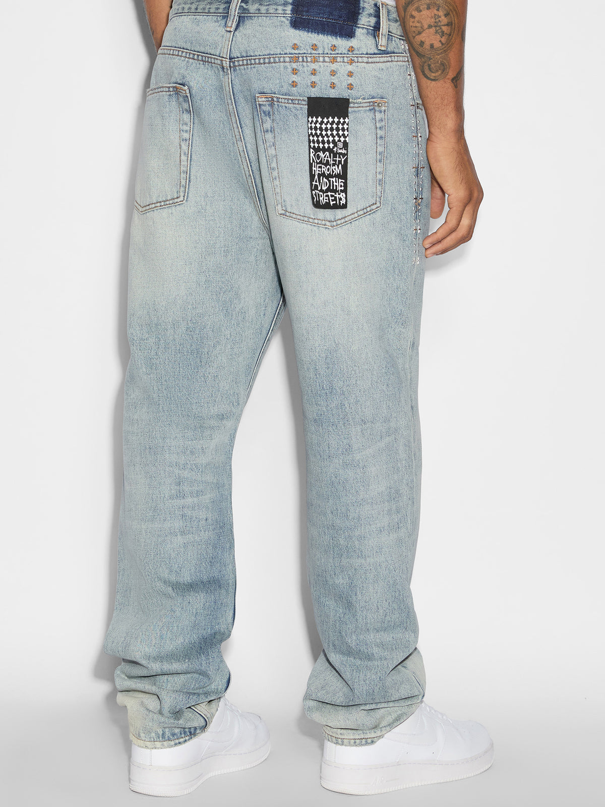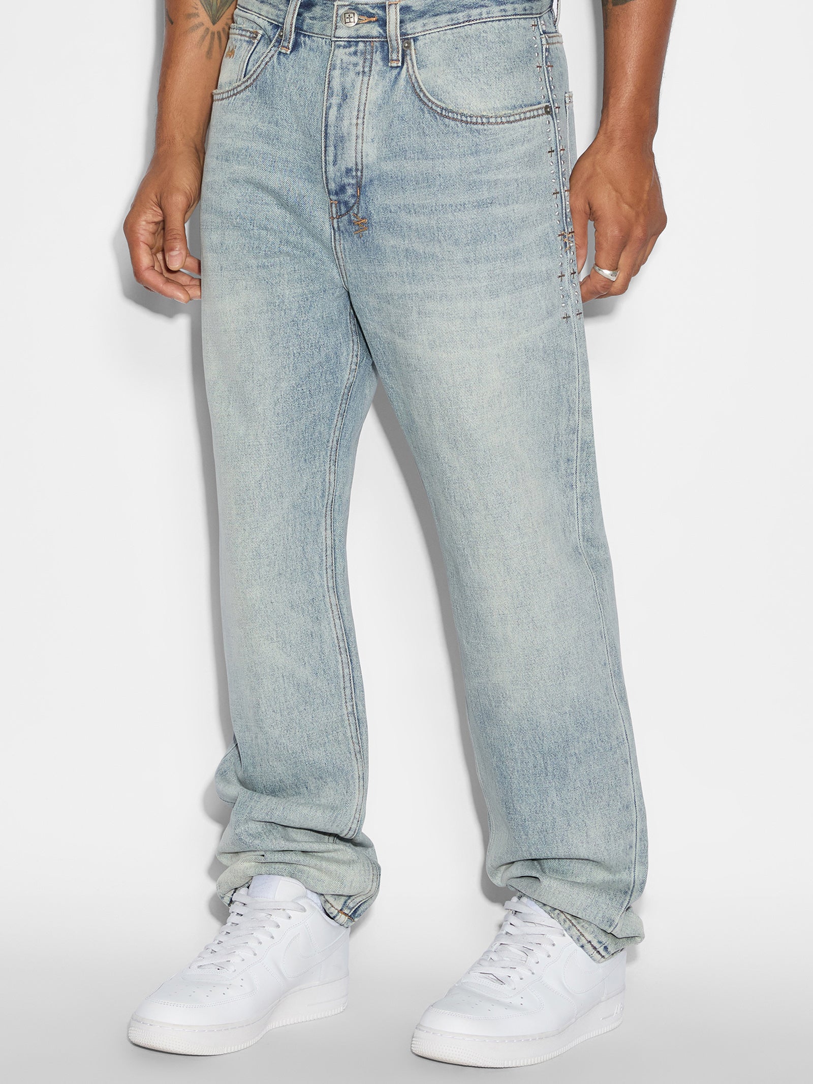 Introducing the KSUBI Anti K Sky High Metal Jeans, a true fashion statement. Featuring a relaxed and baggy fit for ultimate comfort and style. Crafted from rigid denim, these jeans come in a classic washed blue tone. Adding a unique touch, a striking metal pattern runs down the side seam, making these jeans a standout piece in any wardrobe.