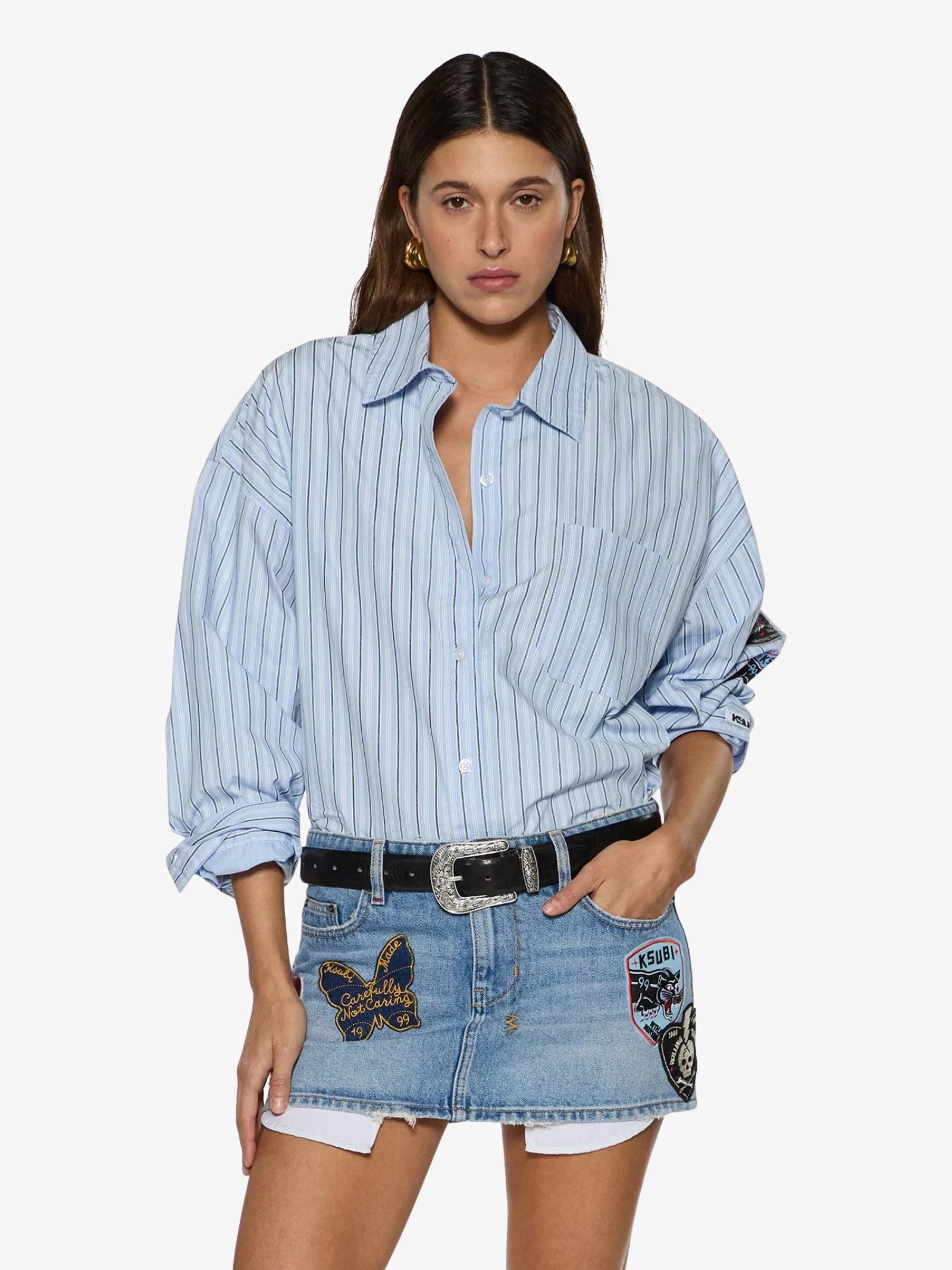 The Astra Ls Shirt Blu Stripe Badge from Ksubi features oversized proportions with seasonal detailing. It has a button front closure, full-length sleeves with exaggerated cuffs, a curved hem, front patch pocket, cross dollar embroidery, and Ksubi varsity patches on the sleeve.