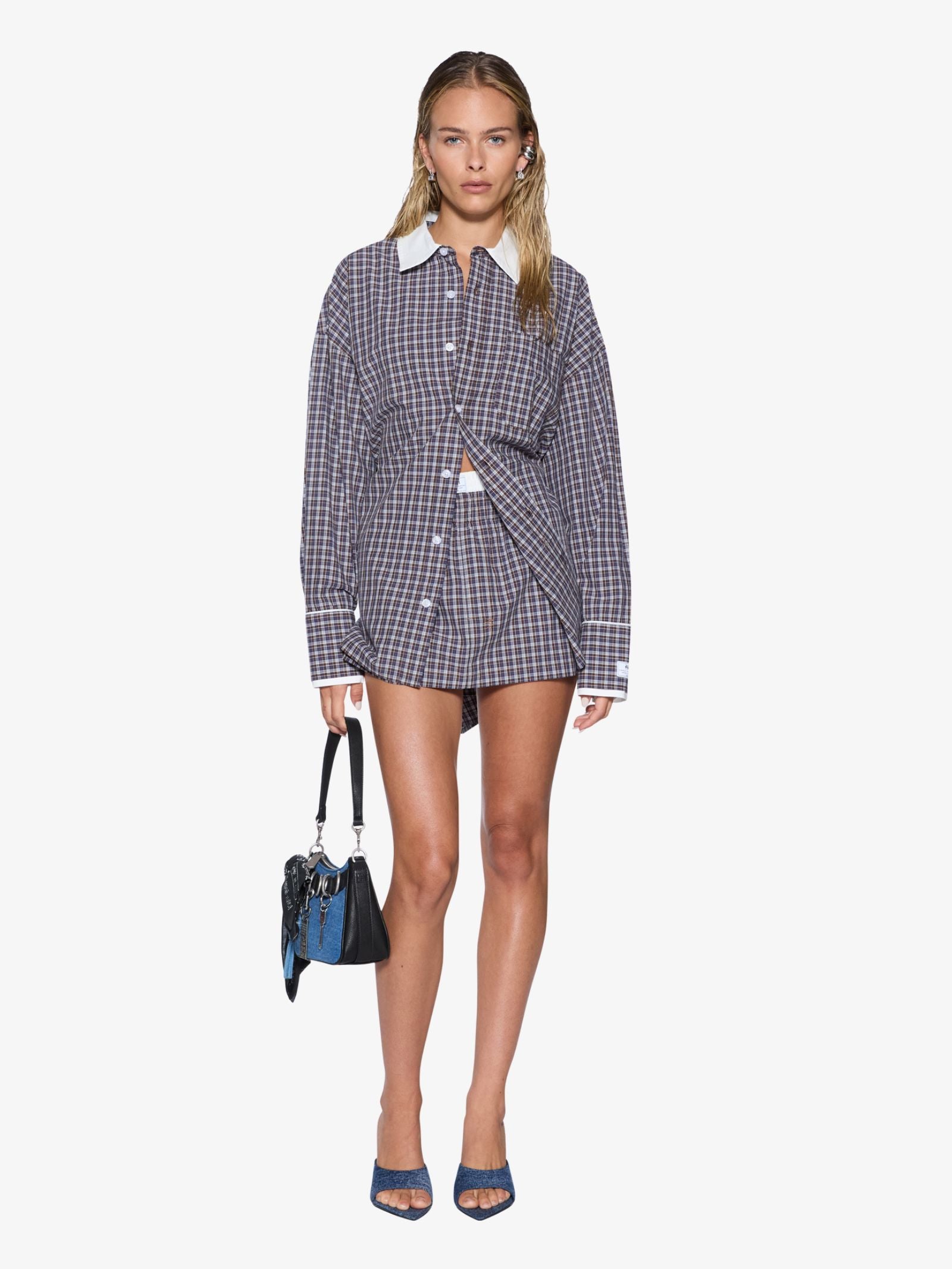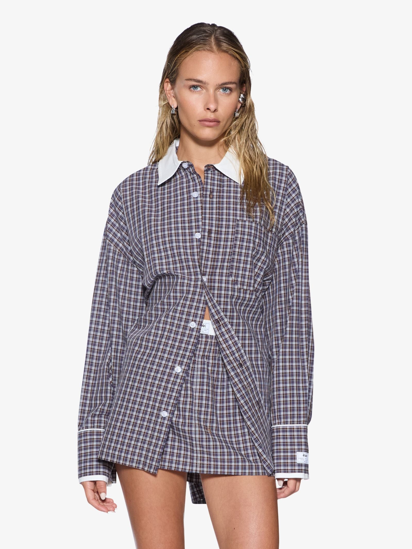 The Astra Ls Shirt by Ksubi is an oversized button-up silhouette defined by a custom handloom plaid in chocolate, blue, red, and white. This garment is visually distinguished by a crisp white contrast collar, exaggerated cuffs, and a curved hemline.