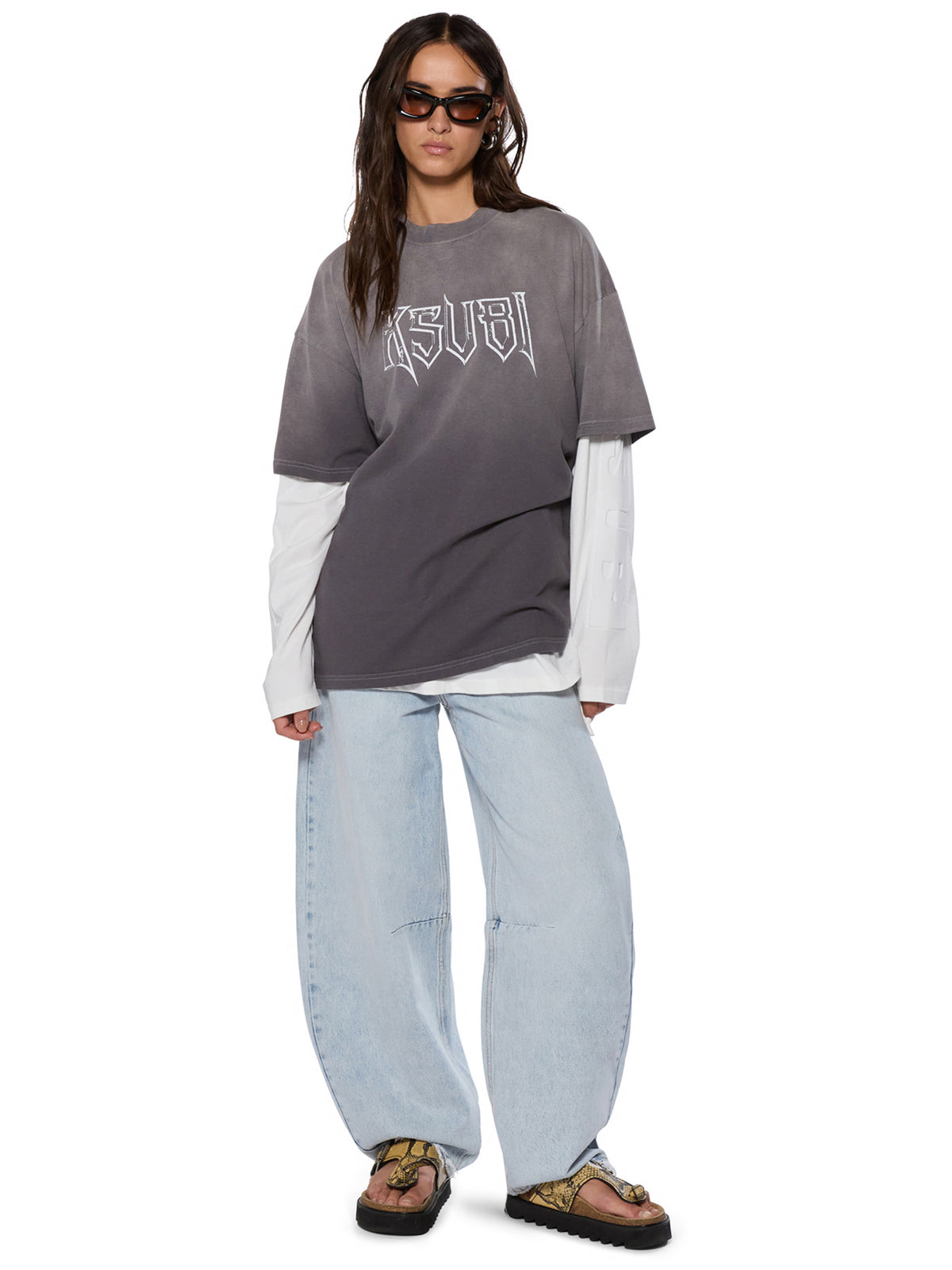 The Barrel Jean Static in Denim by Ksubi features front carpenter patches with rivets that enhance its utilitarian appeal, while anti-silver Ksubi hardware, signature T-box and 3x4 embroidery, and a removable pocket tag complete the design.