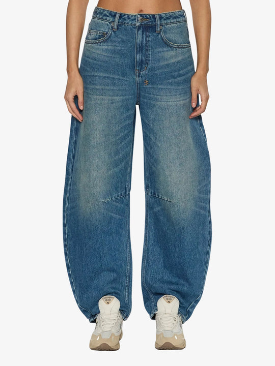 The Barrel Jean Texas Blue by Ksubi introduces a sculptural denim profile through its relaxed fit and signature barrel-shaped leg that tapers at the ankle. The mid-rise waist features a flipped fold-down detail with embossed Ksubi branding, adding a distinctive design touch. Finished with classic pocket styling and signature trims, this jean brings a modern edge to everyday denim.