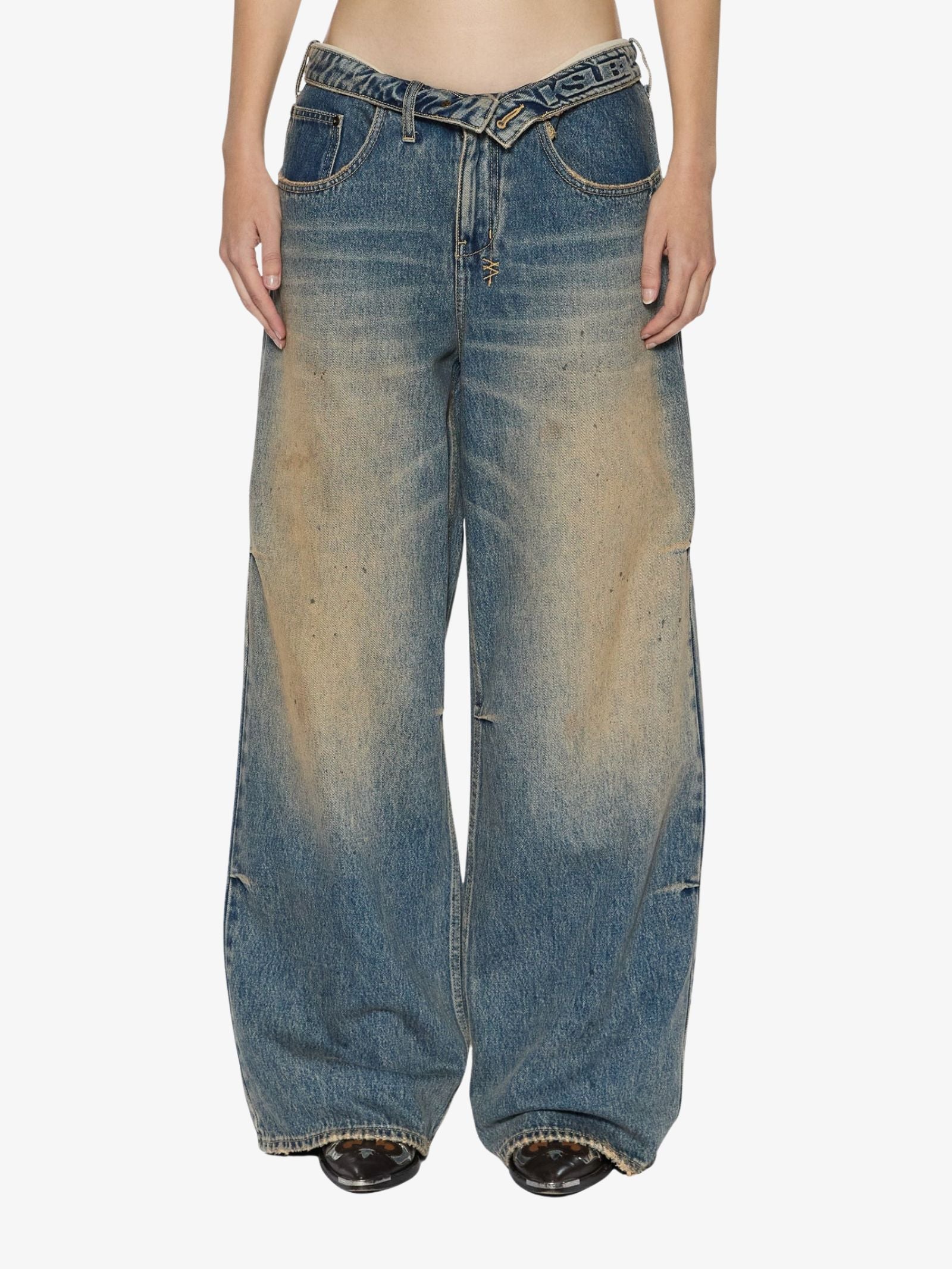 The Ksuper Dune Jean by Ksubi is cut in the brand’s baggiest fit with a super low rise and full length. Made from premium indigo denim with a tinted wash, it features contrast fading, oil blotches, and a flipped waistband embossed with Ksubi branding.