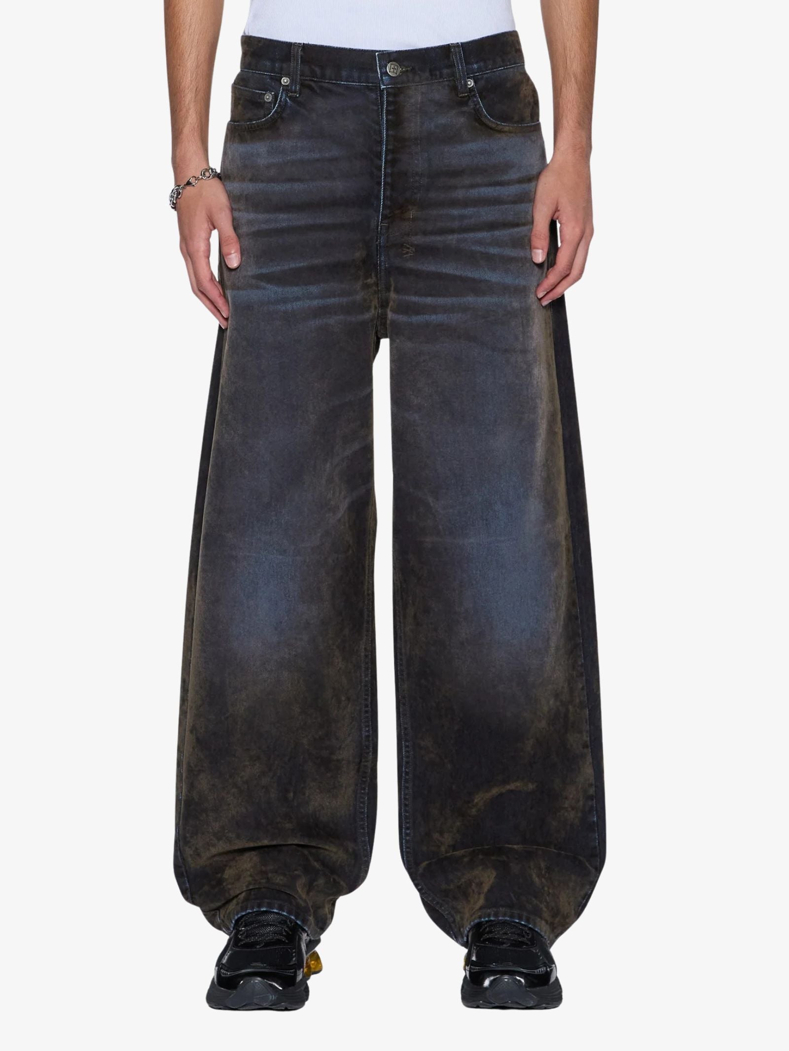 Exaggerated straight leg denim with a long rise, the Maxx Blur Ink Jeans from Ksubi features a button fly, pocket details, and a distinct hem finish. T-box and 4x4 cross embroidery add signature flair, complemented by branded hardware and a woven pocket tag.